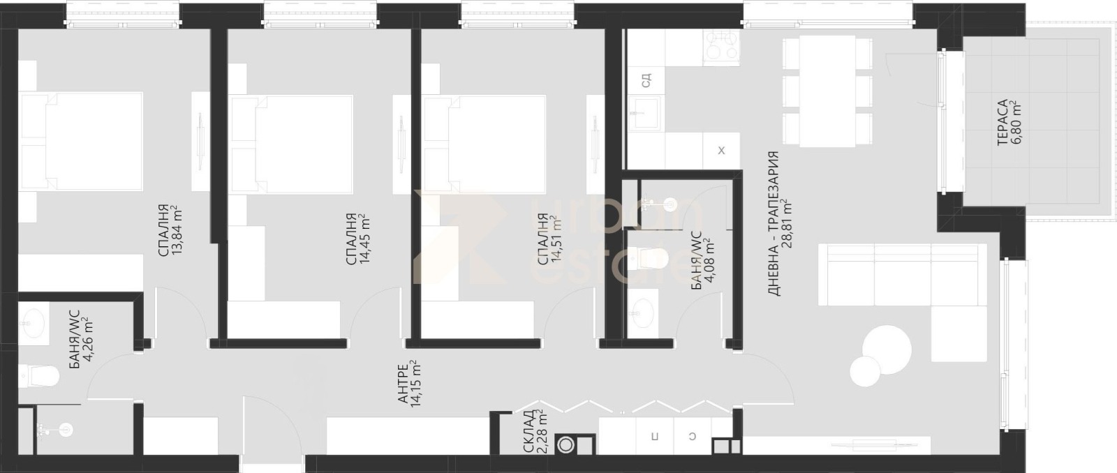 URBAN ESTATE presents an exclusive opportunity to purchase a three-bedroom apartment in a highly preferable area of Lozen, located just 15 minutes from Sofia.