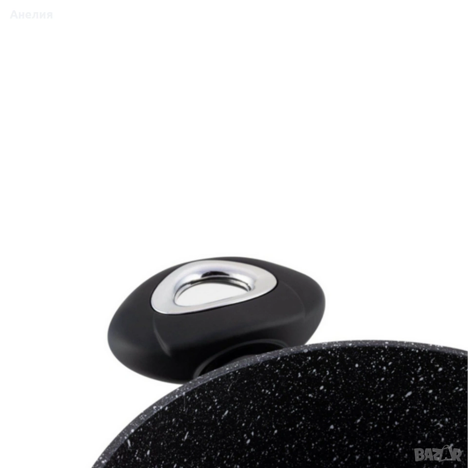 Комплектът съдържа пресован алуминий с керамично-мраморно покритие, което е без PFOA и устойчиво на надраскване. Подходящ за газови, електрически и индукционни котлони. Капаците са от закалено стъкло с отвор за пара. Дръжките са меки на допир, силиконови за по-голям комфорт при работа. Размерите и вместимостите са следните: