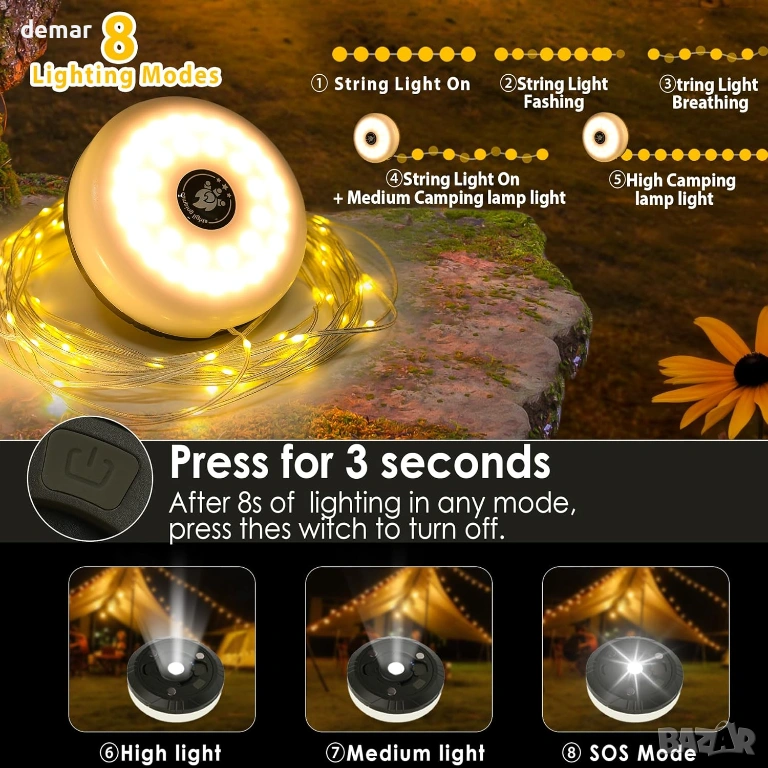 LED къмпинг гирлянди 10 м, 3 в 1, водоустойчиви, 8 режима, топло бяло