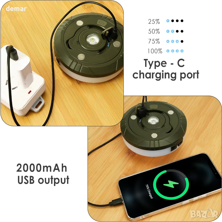 Акумулаторна къмпинг лампа с вградена батерия 2000mAh, предлагаща около 3–8 часа работа с едно зареждане и удобно USB зареждане, с индикатор за захранване и функция за аварийно захранване (5V/1A) за зареждане на мобилни устройства. Комбинира къмпинг фенер, фенерче и 10-метрова гирляндова лампа в едно компактно устройство, създавайки топла, атмосферна светлина с енергийно ефективно LED осветление. Здравата медна тел с прозрачно PVC осигурява гъвкаво, устойчиво на заплитане 360° осветление, докато водоустойчивият корпус IPX4 и водоустойчивата светлинна лента IP65 гарантират надеждна употреба на открито. Ръчно завъртащата се макара позволява бързо съхранение без заплитане, а лекото компактно тяло включва магнитна основа и кука за окачване за лесно поставяне върху палатки, раници, дървета или метални повърхности. Множеството режими на осветление и нива на яркост позволяват регулируемо осветление за къмпинг, градинска декорация, партита, фестивали или аварийно осветление.