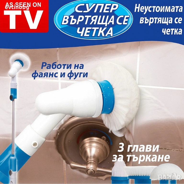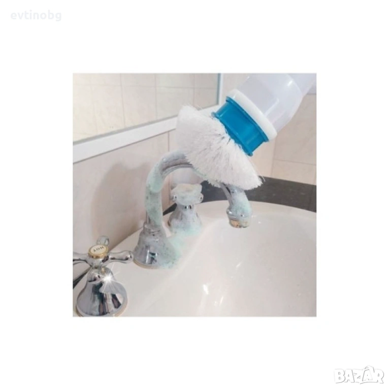 Електрическа четка за почистване на баня Spin scrubber/ Четката работи с акумулаторна батерия. Тя се зарежда от електрическата мрежа. Приставки към нея позволяват да почистите бързо големи площи, ъгли и аксесоарите в банята. Необходимо е да напръскате повърхността с подходящ препарат. След това включете четката в действие./Размер: 107 см * 8 см * 12 см; Време за работа: около 1 час;/Комплекта включва: Електрическа четка за почистване на баня; Почистващи четки; Акумулаторна батерия; Адаптер; Гаранция 12 месеца.