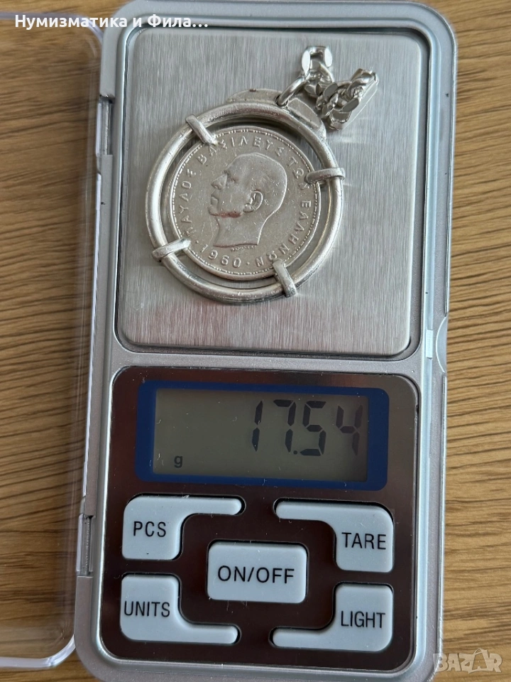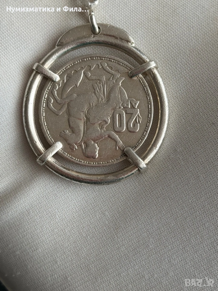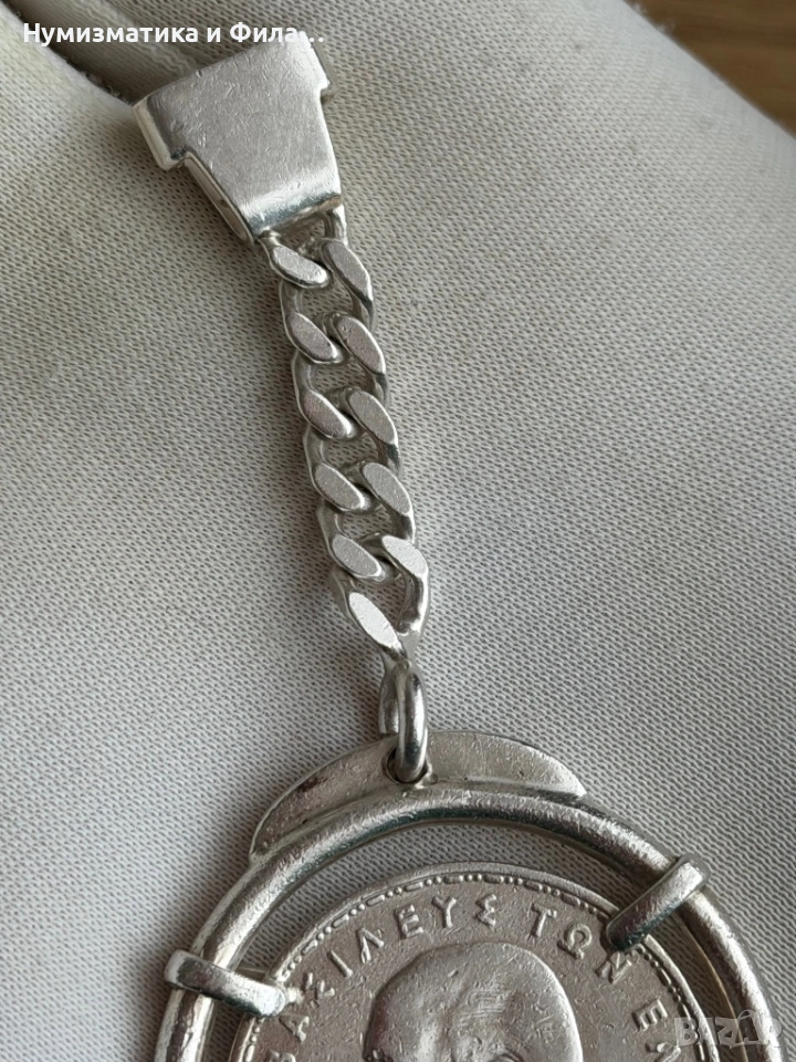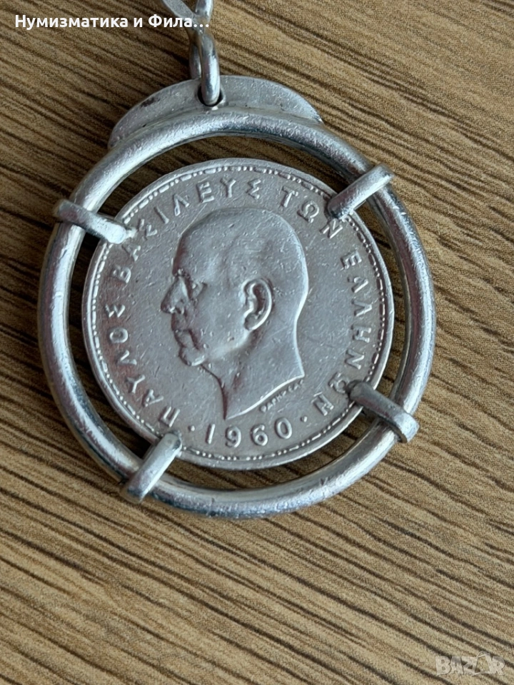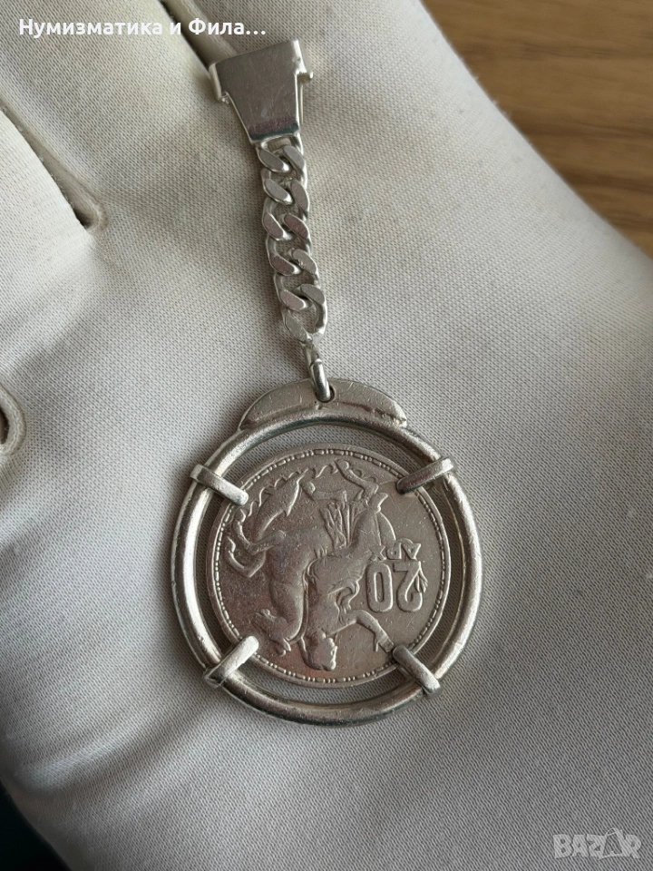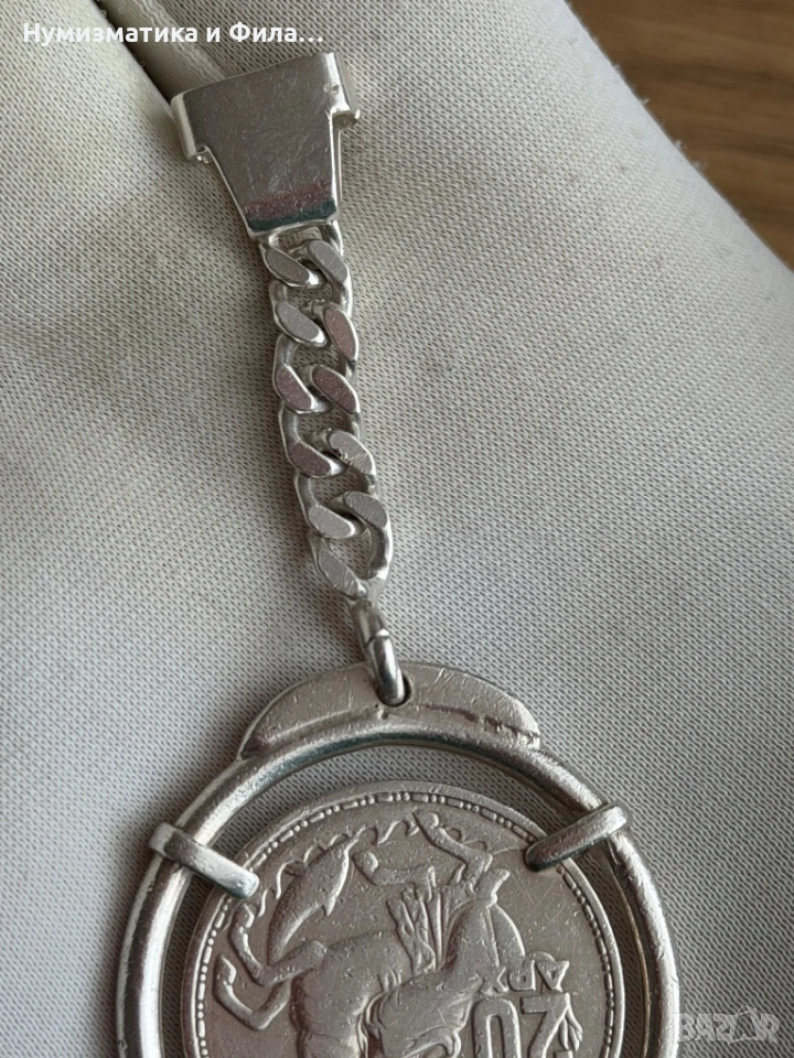 Предлагам красив сребърен ключодържател, изработен с оригинална гръцка сребърна монета 20 драхми от 1960 година. Монетата е от истинско сребро и е отличен колекционерски елемент, съчетан с практична употреба.