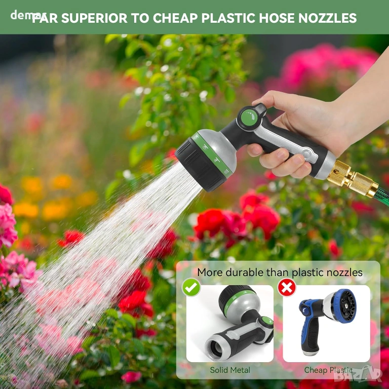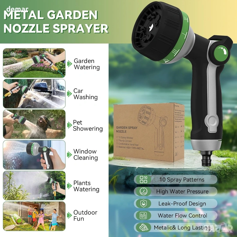 метален пистолет за пръскане за маркуч, проектиран за дълготрайна употреба на открито, с устойчива на ръжда и корозия конструкция и защитно печен емайлирано покритие. Оборудван с подобрено управление с палец, което позволява лесно регулиране на водния поток, като същевременно намалява напрежението на пръстите по време на продължителна употреба. Включва 10 регулируеми режима на пръскане, подходящи за широк спектър от задачи, от мощно почистване до нежно поливане на растения. Ергономичният дизайн включва гумен диск, абсорбиращ ударите, и удобна неплъзгаща се дръжка тип пистолет, осигуряваща сигурно хващане и подобрен комфорт при градинарство, миене и други задачи за почистване на открито.