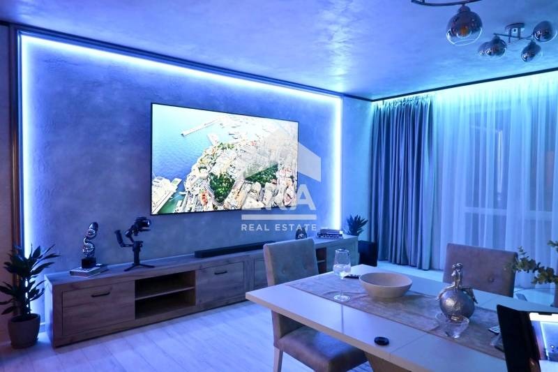 Апартаментът е с площ от 123 кв.м. и изложение север юг, което осигурява приятна естествена светлина през целия ден. Пространството е организирано изключително функционално и включва просторна дневна с кухненски бокс и трапезария, която е напълно обзаведена и оборудвана. В дневната има монтиран висок клас климатик, а кухнята е модерно изпълнена с вградени електроуреди, включително съдомиялна машина. От дневната има излаз към остъклена и оборудвана тераса, която може да се използва като допълнително уютно пространство за отдих.