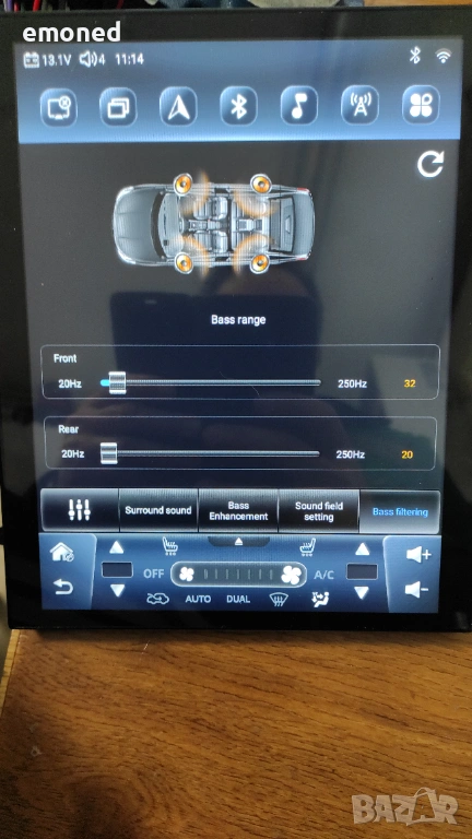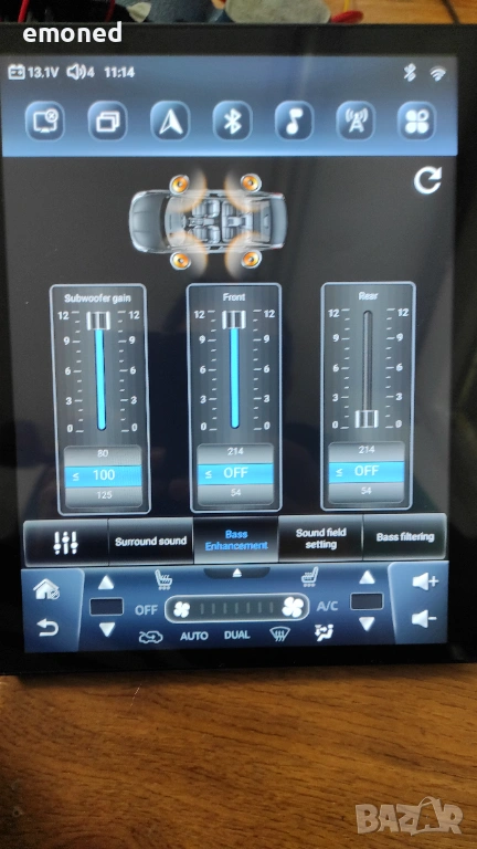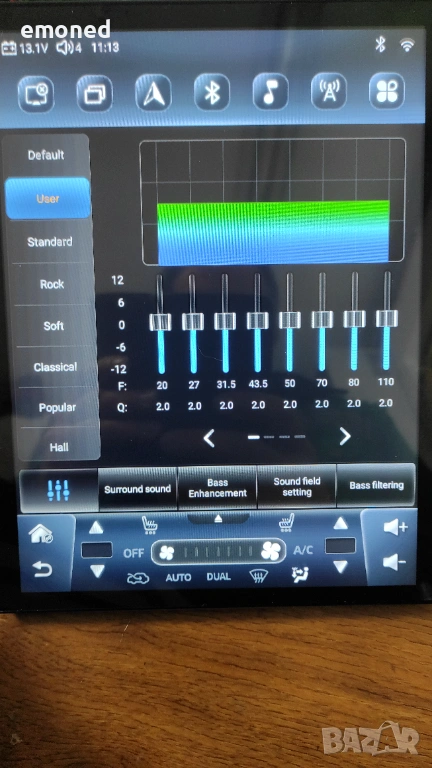 Тъчът реагира адекватно, не е нужeн силен натиск. С този процесор (UIS7862S) се осигурява много добро бързодействие. Мултимедията изпада в сън, след изваждане на ключа. Събужда се за няколко секунди. Даже след рестарт, зареждането е много бързо. След заспиване консумацията е 0.001А. Това в момента е един от най-добрите процесори за мултимедии. На повечето обяви не се споменава какъв е процесора. Мултимедията разполага с 3 USB входа. Поддържа включване на видеорегистратор, система за контрол налягането на гумите. И двата модула се купуват отделно. Има WIFi и Bluetooth свързаност. В комплекта има външен микрофон, 4G и GPS антена. Има слотове за две SIM карти. Не съм поставял СИМ карти за тест. Звукът е на много високо ниво. Разполага с 32 полюсен еквалайзер. Има вграден реален DSP процесор BU32107EFV. Има оптичен и коаксиален изход за връзка с външен усилвател и/или ЦАП.