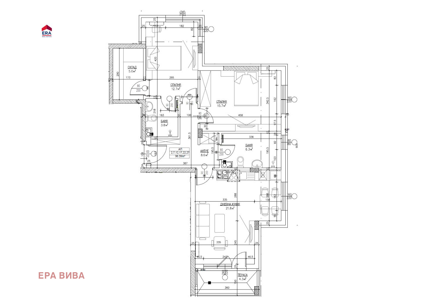 ЕРА Вива продава тристаен апартамент в близост до метростанция 'ген.Владимир Вазов', кв.Левски Г, гр. София. Предлаганото жилище е с площ 114.14 кв.м. /96.40 кв.м. застрoена площ/. Разположено е на четвърти етаж от общо девет и се състои от входно антре /8.60 кв.м./, дневна с трапезария /21.90 кв.м./, спалня /15.70 кв.м./, втора спалня /12.70 кв.м./, баня с тоалетна /4.00 кв.м./, склад /5. 00 кв.м./ и тераса /4.30 кв.м./. Изложението е юг/север/запад . Жилището се издава завършено по БДС - на шпакловка и замазка, с поставена входна врата. За повече информация вж. раздел 'План'.Сградата ще бъде построена с висококачествени материали, за да се създаде висок стандарт, уют и спокойствие на живущите. Фасадата ще бъде изпълнена с 10 см. топлоизолация, дограмата ще бъде от 5-камерен немски РVС профили, с троен стъклопакет с нискоемисионно стъкло. Входна врата на апартамента блиндирана със секретна брава Солид 55 . За максимален комфорт на живущите ще има асансьор и контролиран достъп. Има възможност за закупуване на открито паркомясто, подземно паркомясто, партерен или подземен гараж. Отлична локация! Сградата се намира на 5 минути пешеходно разстояние от новоизграждащата се метростанция ген.Владимир Вазов , на пешеходно разстояние от сграда се намират 199 Основно Училище 'Св. Апостол Йоан Богослов' и 130 СУ Стефан Караджа , общински детски градини, ДГ 92 Мечта и ОДЗ 91 Слънчев кът'. Районът е с добре изградена инфраструктура, в близост се намират супермаркети, банки, аптеки, детски площадки и спортни съоръжения.Отлична локация! Сградата е на 5 минути пешеходно разстояние от новоизграждащата се метростанция ген.Владимир Вазов , на пешеходно разстояние от сграда се намират 199 Основно Училище 'Св. Апостол Йоан Богослов' и 130 СУ Стефан Караджа , две общински детски градини, ДГ 92 Мечта и ОДЗ 91 Слънчев кът'. Районът е с добре изградена инфраструктура, в близост се намират супермаркети, банки, аптеки, детски площадки и спортни съоръжения.