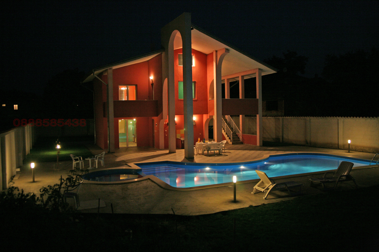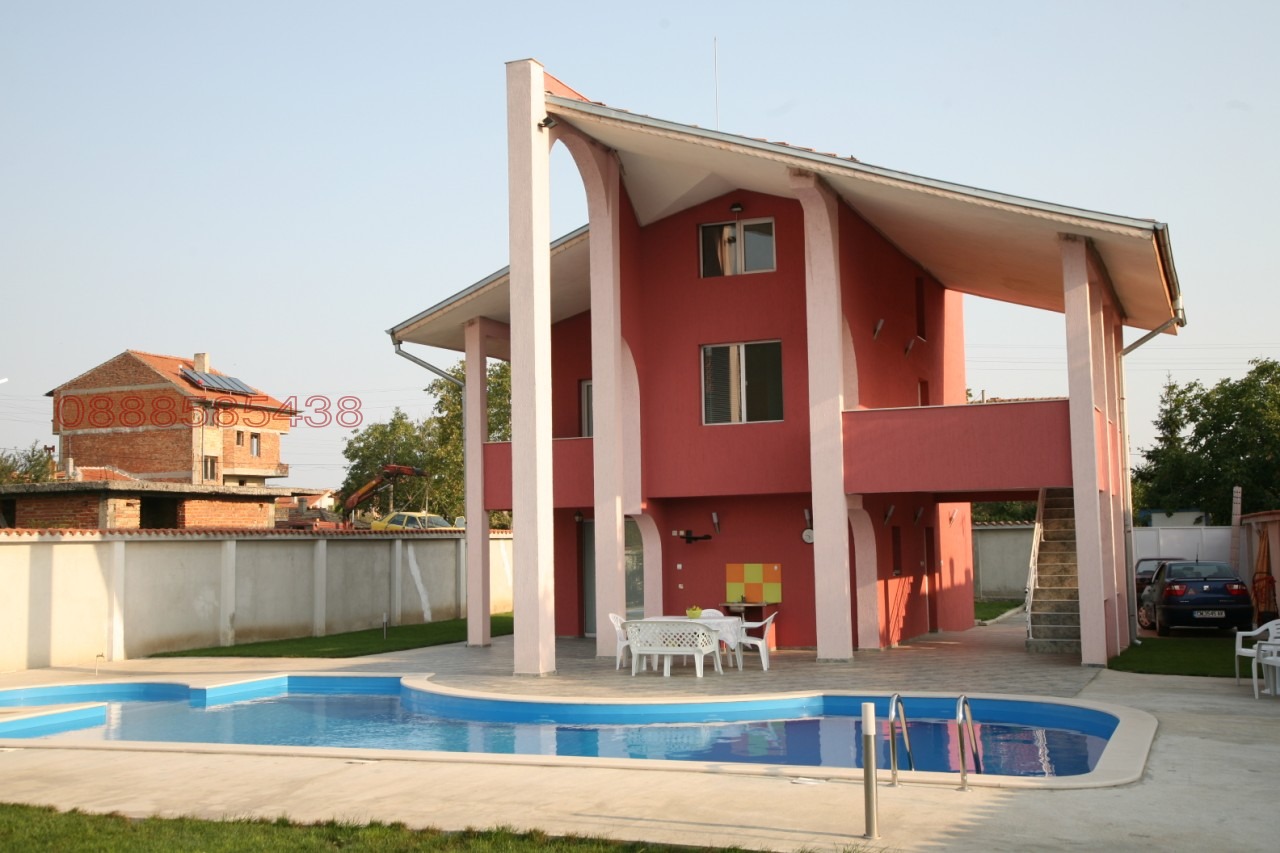 Изградена подземна автоматична поливна система за тревните площи. Изградена автоматична система с капково напояване за зеленчуците от намиращия се в двора собствен водоизточник. Масивна двуметрова ограда, осигуряваща спокойствие и уединение. Къщата се състои 2 жилищни етажа и един тавански (скосен). Първият етаж включва просторна дневна с трапезария, спалня, кухня и баня с тоалетна. Вторият етаж се състои от 3 спални с баня и тоалетна. Двата етажа имат самостоятелни входове и външно свързващо ги стълбище. Голяма функционална веранда на първи етаж с кът за хранене на открито и ратанов сет за кафе и шезлонги край басейна. Вторият етаж също разполага с голяма веранда и 1 тераса.