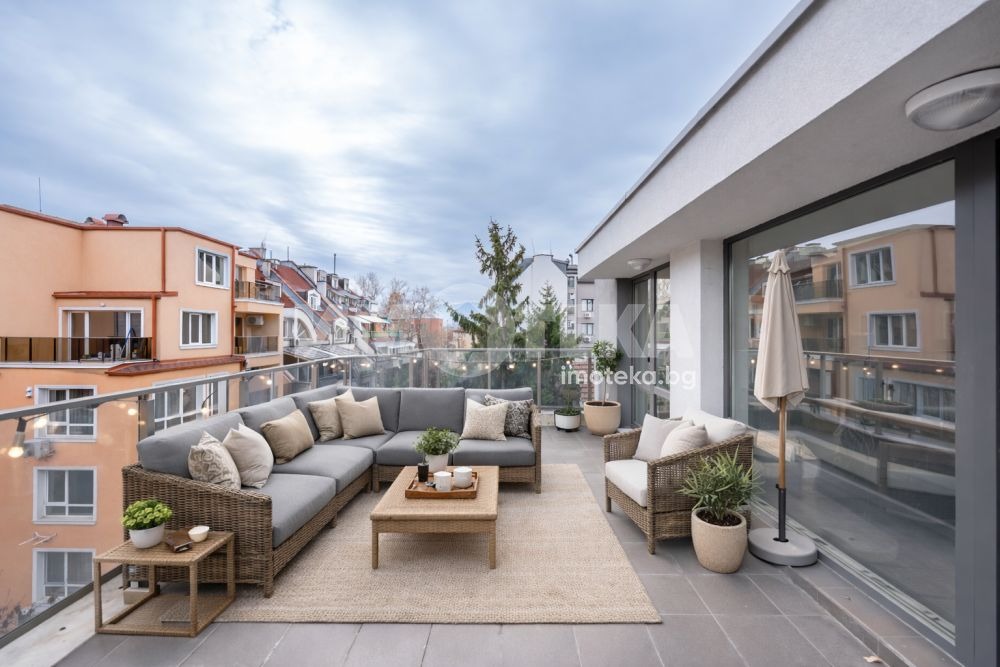 Ексклузивно! Предлагаме на вниманието Ви панорамен, тристаен апартамент с площ 148 кв.м. Имотът е самостоятелен на етаж и се състои от дневна с трапезария и кухненски бокс, 2 спални, коридор, 2 санитарни помещения, 3 тераси, едната от които панорамна/около 20 кв.м./. Избеното помещение с площ 28кв.м. е екстра към имота, а също и безшумният асансьорът с директен достъп до апартамента. Имотът се предлага на шпакловка и замаска. Възможност за покупка на паркоместо на отделна цена и паркиране на втора кола. Към имота принадлежат 67,30/396 идеални части от поземления имот.