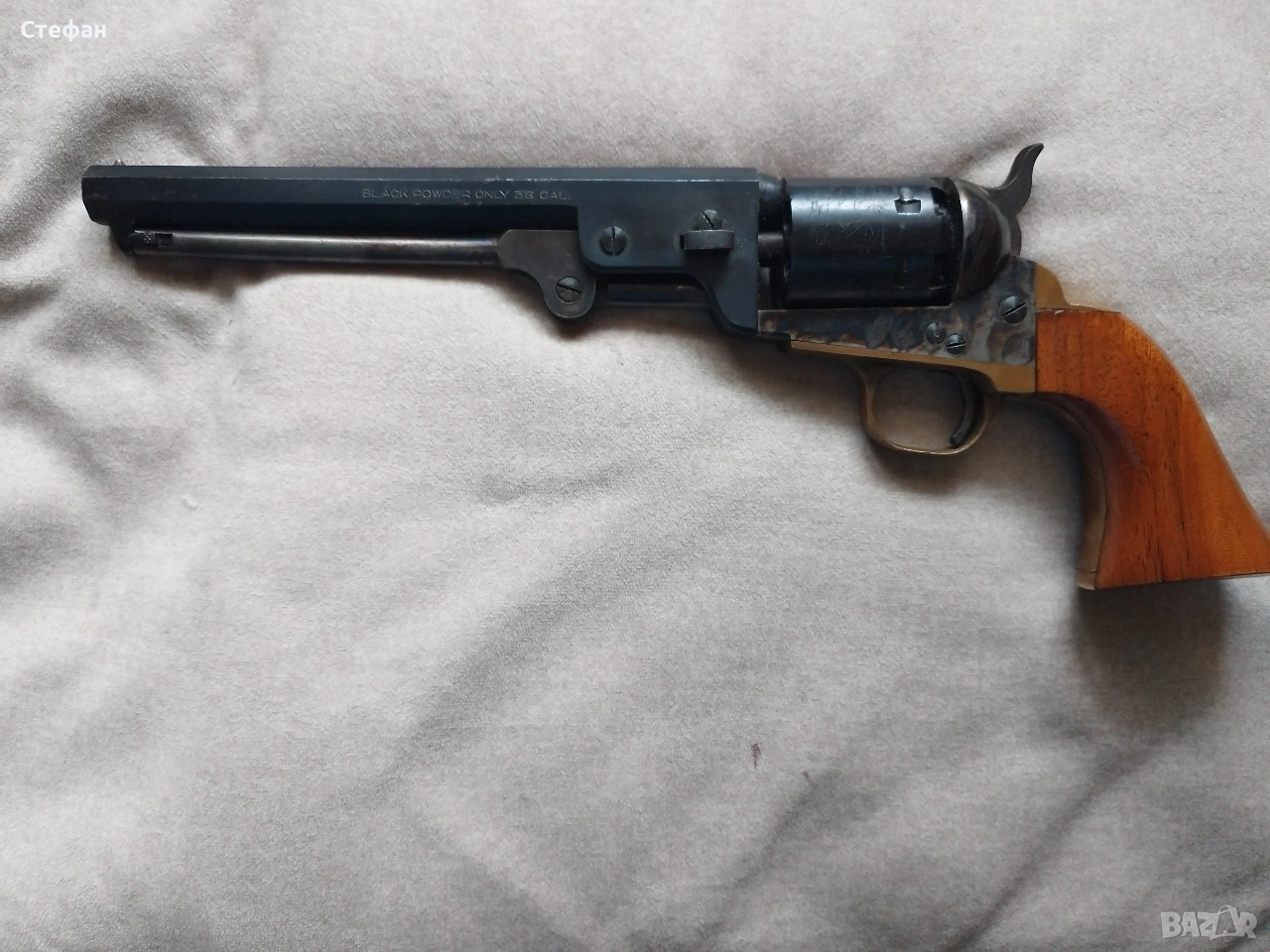 Револвера е освободен от закона,защото е преднопълнещ с черен барут.Състояние отлично,дължина 36см.фиксира и работи перфектно.Идеален за въстановки и интериор.