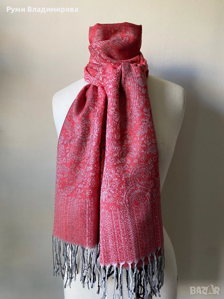 Шал от 100 % кашмир в червени нюанси, със сиво и черно, графична и релефна материя, лъскава и грациозна материя, доставка с Еконт, цена 15€.