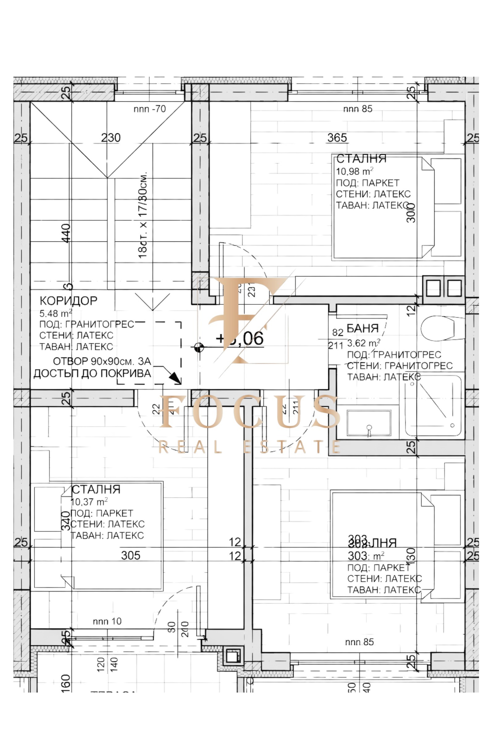 Втори етаж - три спални, баня с тоалетна и тераса.