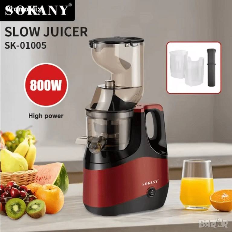 Sokany SK01005 е бавнооборотна сокоизтисквачка с мощен 800 W мотор, която работи с 75 оборота в минута и ефективно изцежда сок от цели плодове като ябълки, портокали и др.