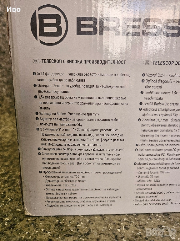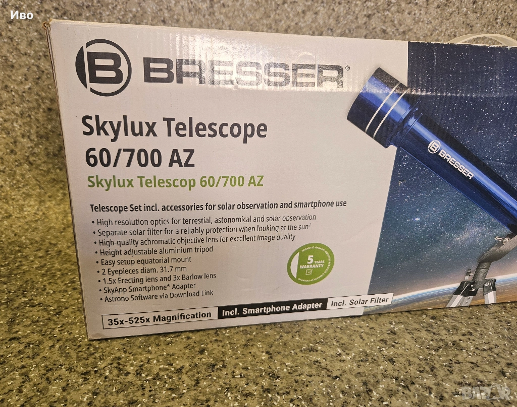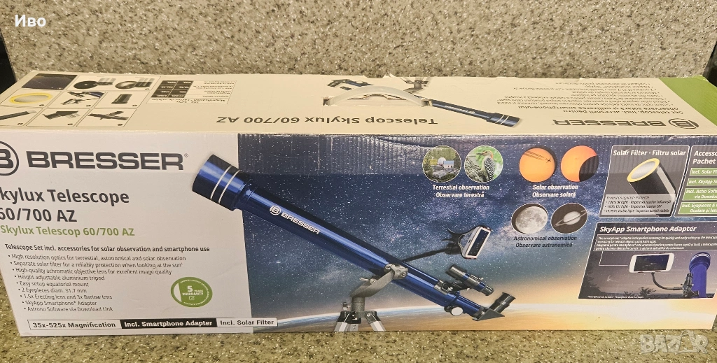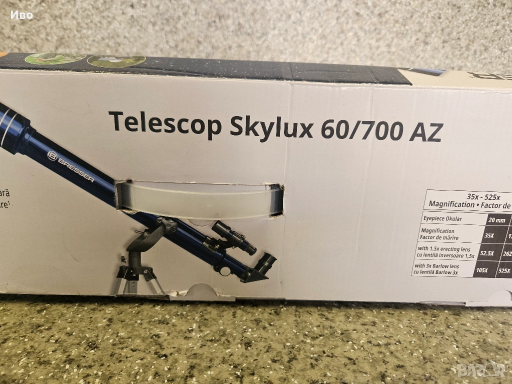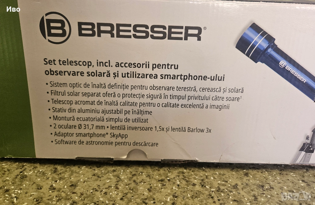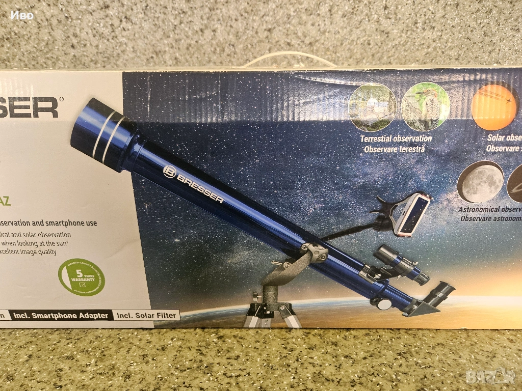 Продавам чисто нов лещов телескоп (рефрактор) от реномираната немска марка Bresser. Устройството никога не е ползвано и е в оригиналната си окомплектовка.