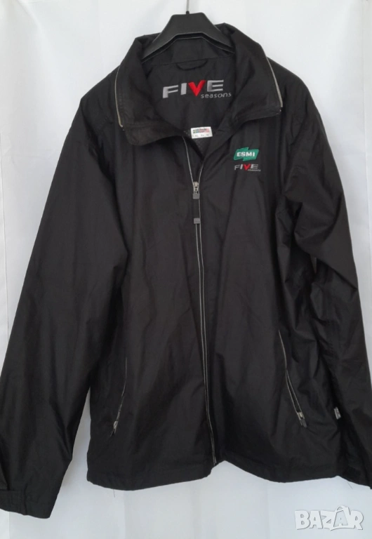 Марково яке висок клас Якето е спортен модел в черен цвят, с изчистен дизайн и права кройка. Разполага с преден цип, висока яка и странични джобове. На гърдите има малко лого в зелено и бяло, а на гърба е изписано „FIVE seasons“ с бели и червени букви. Моделът е функционален, без качулка, подходящ за ежедневно носене или спортни активности.