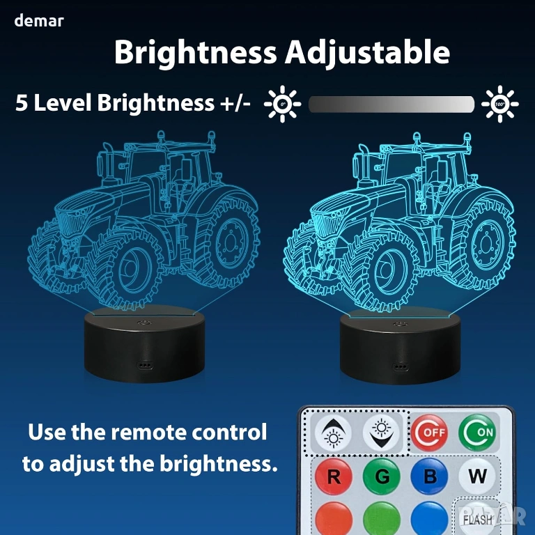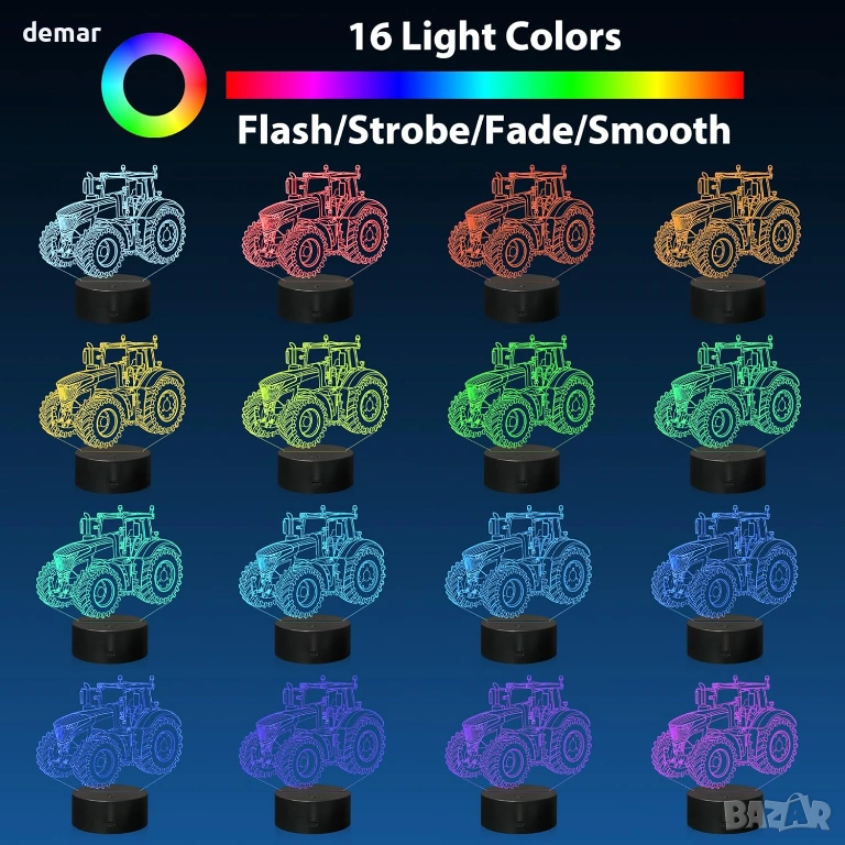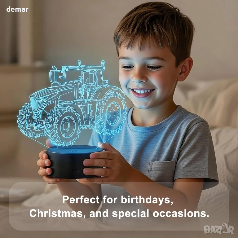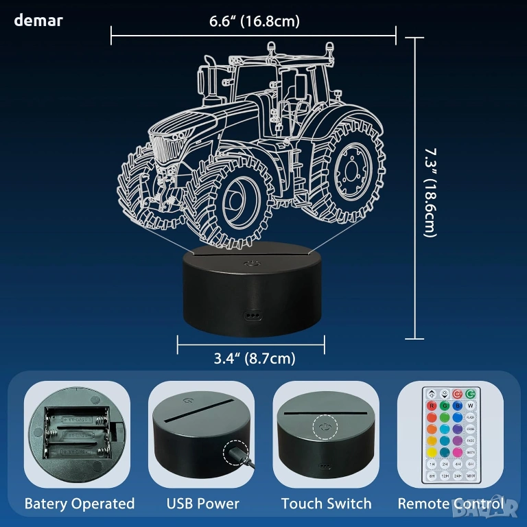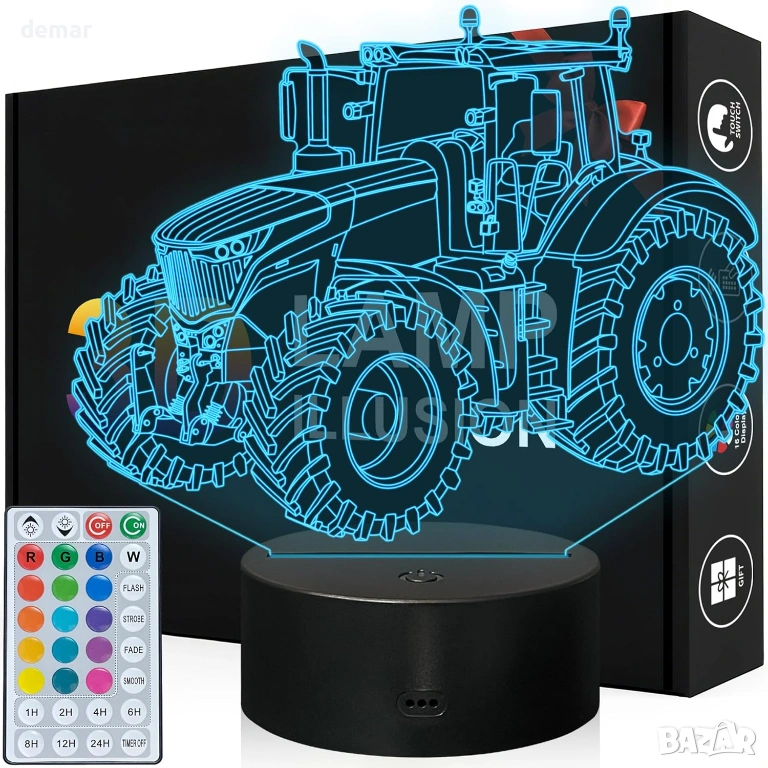 Разполага с лазерно гравиран акрилен панел, който създава впечатляваща 3D илюзия на трактор с меко LED осветление, което го прави декоративна