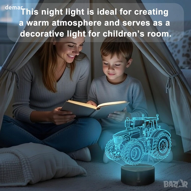 нощна лампа, подходяща за детски стаи и пространства с селска тематика. Лампата може да се управлява или чрез докосване на основата, или с включеното дистанционно управление, предлагайки 16 цветови опции, множество режими на осветление и регулируема яркост, за да създаде успокояваща атмосфера. LED светлината е без трептене и е равномерно разпределена, проектирана да бъде нежна към очите и подходяща за бебета, малки деца и деца, а екологичните материали гарантират безопасна ежедневна употреба. Захранва се чрез USB за удобна работа и ниска консумация на енергия, комплектът включва LED основа, акрилна плоча, дистанционно управление, USB кабел и ръководство за потребителя, което го прави лесен за сглобяване и готов за незабавна употреба, както и добре обмислена идея за подарък за деца, които се наслаждават на декор с превозни средства и селска тематика.