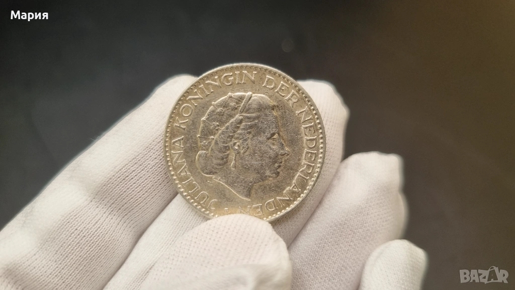 Монетата е с образа на кралица Юлиана и герба на Нидерландия. Подходяща е както за колекционери, така и за любители на стари сребърни монети.