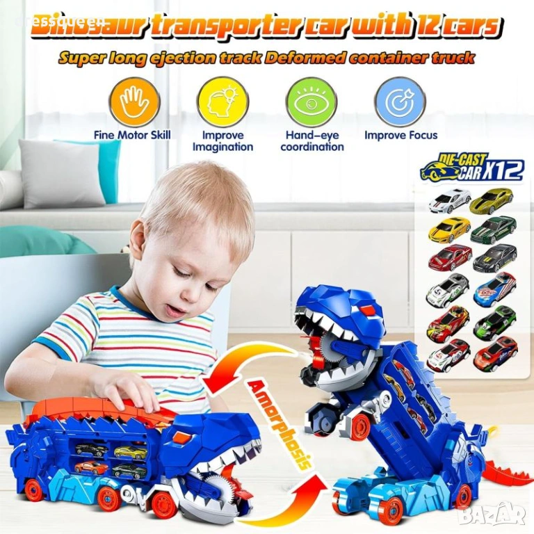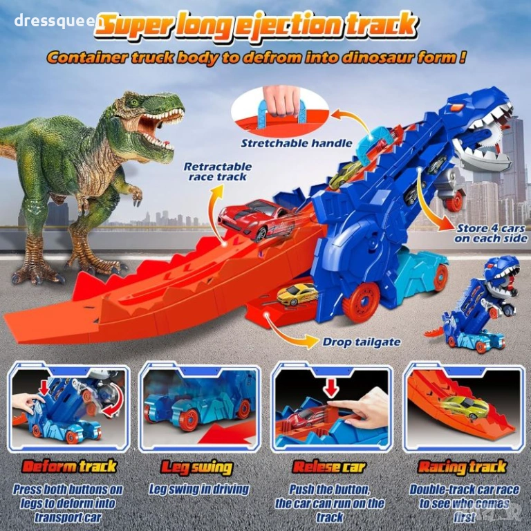 Дизайн: Уникален камион влекач с динозавър дизайн, който се трансформира от автовоз в голяма писта за изстрелване.
