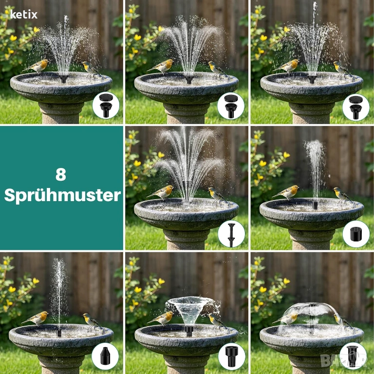 Направи си сам соларен фонтан и соларни водни елементи: 10 различни дюзи предлагат разнообразие от опции за пръскане, а пяната от памук позволява лесно настройване към всяко езерце или басейн. С включената водопроводна тръба можете да създадете красив воден елемент или соларен фонтан в градината.