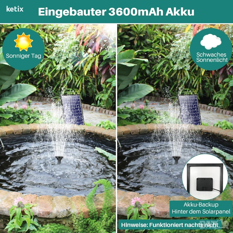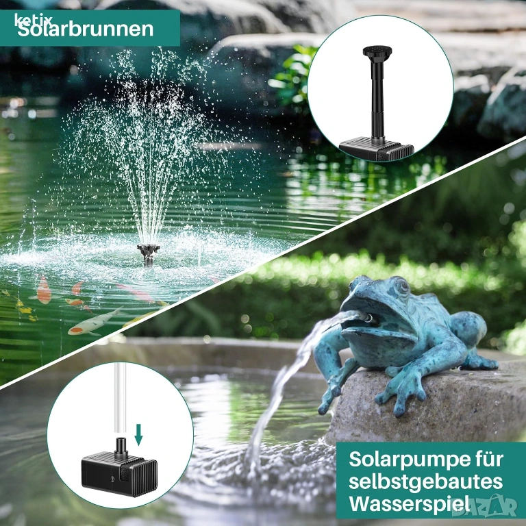 Универсална: Нашата слънчева помпа за езерце с батерия е идеална за птичи вани, езерца, циркулация на вода, фонтани, езерца за жаби, градини, водопади и аквариуми. Тя ще освежи градината ви и ще я обогати с естествена красота и радост.
