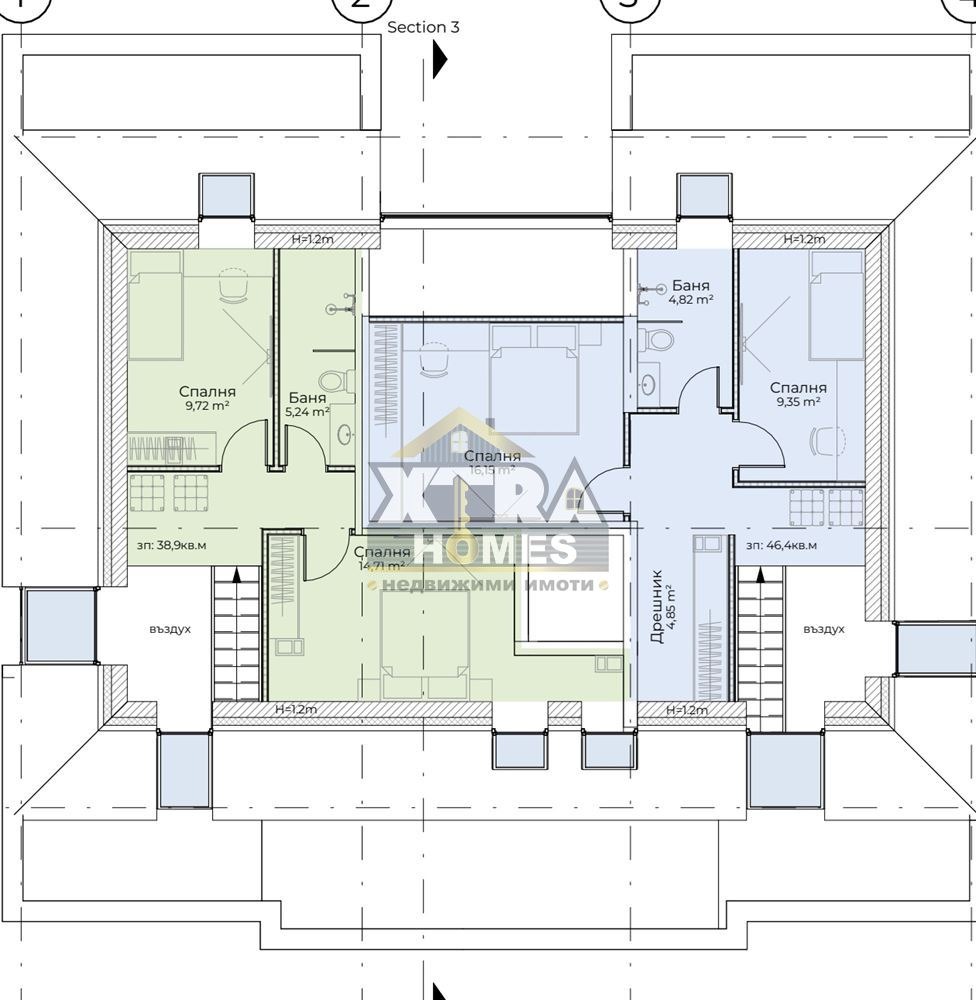 🛏 Ниво 2: Три спални родителска 23 кв.м с отделна баня и тоалетна (ен-сют); втора спалня 16 кв.м; трета спалня 10 кв.м + практичен дрешник 5 кв.м.