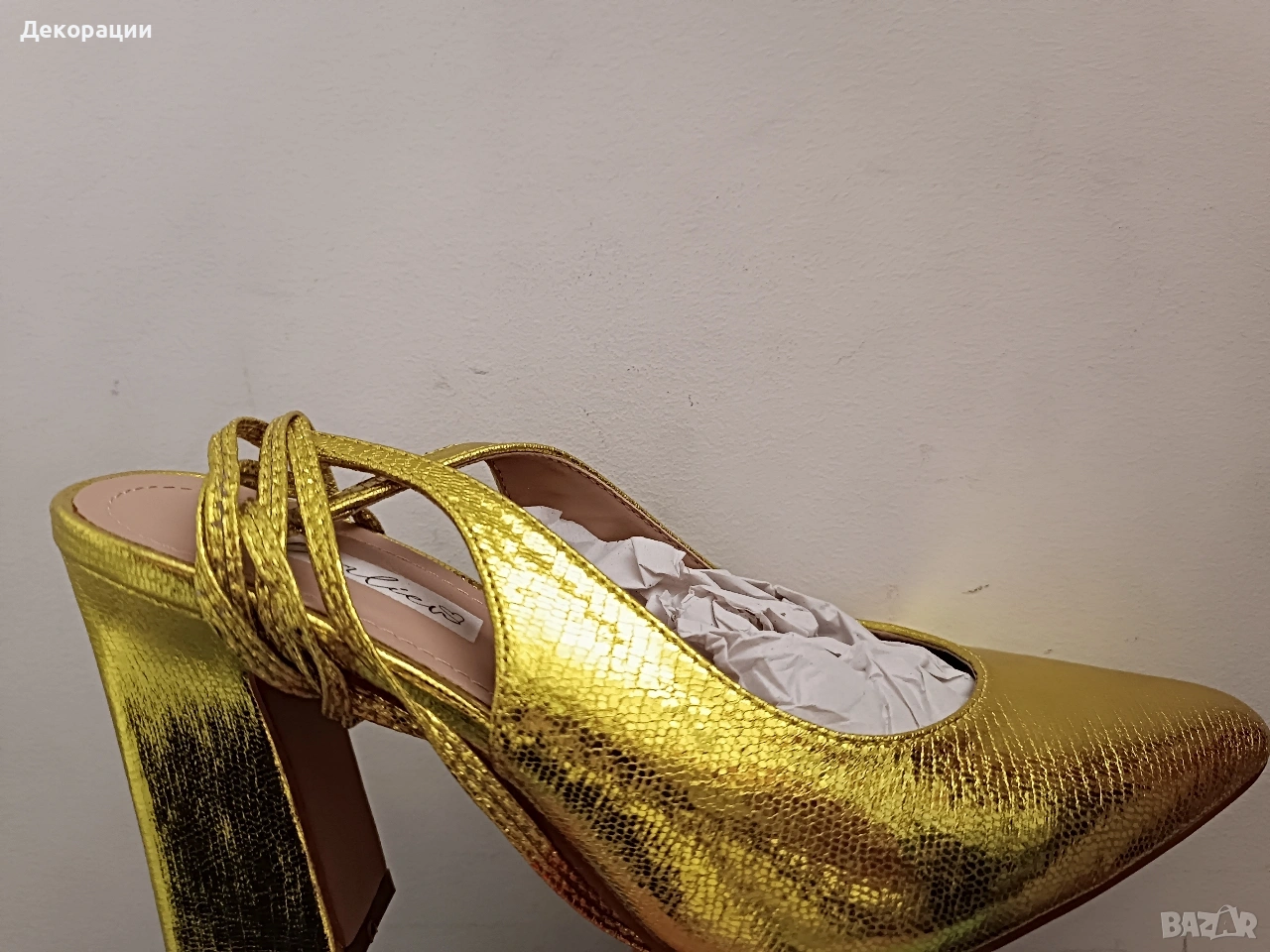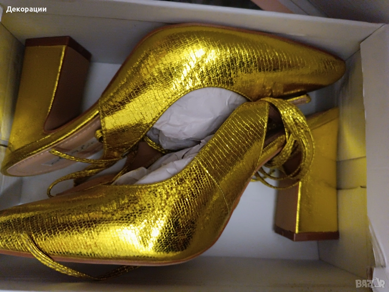 Чисто нови дамски обувки на ток номер 38.Завързват се с връзки които се овиват около крака.Изключително интересен златист цвят със леко зеленикав оттенък.