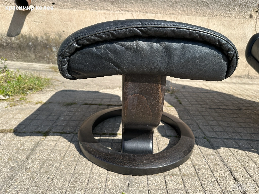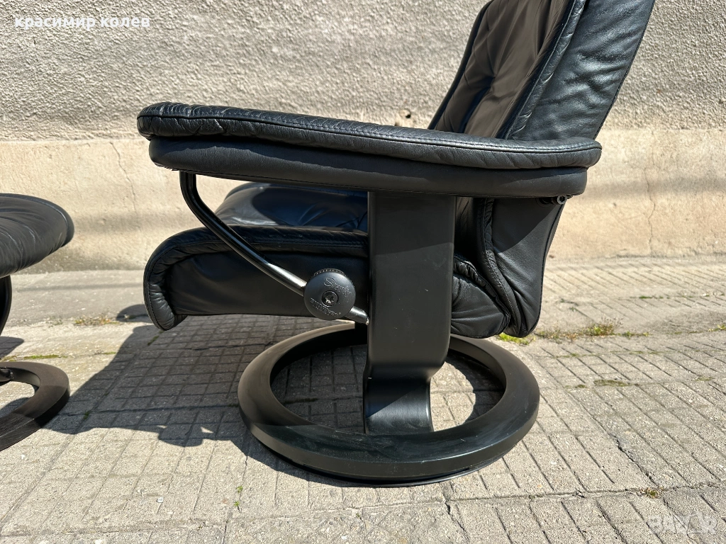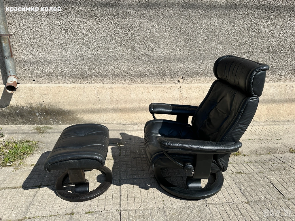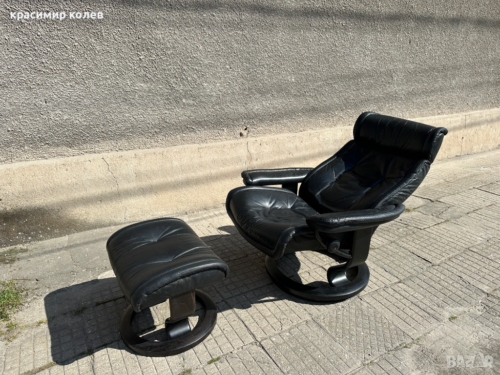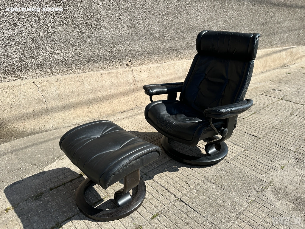 Stressless е една от най-известните и търсени марки за комфортни столове в света – стартирана през 1971 г. с първия модел, известен с иновативната си система за поддръжка на тялото (Plus™ система с glide функция, която позволява на стола да се движи с теб, 360° въртене, регулиране на наклона и отлична ергономия). Те са направени от висококачествена кожа (тук черна, вероятно top-grain leather), с дебела подплата, здрава метална/дървена рамка и често включват отделен ottoman (подложка за крака), която се движи синхронно.