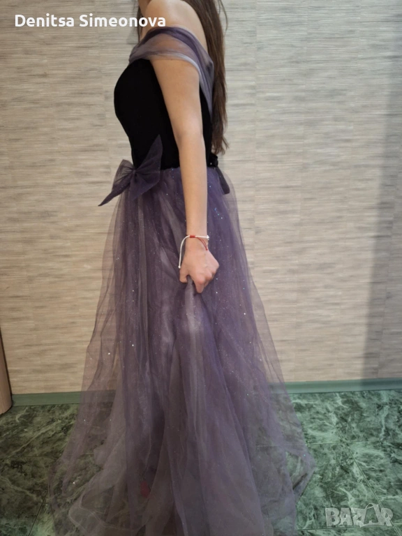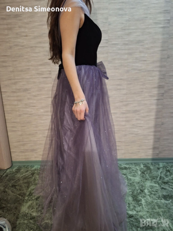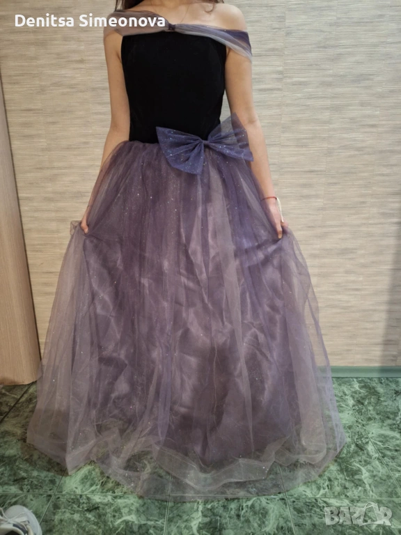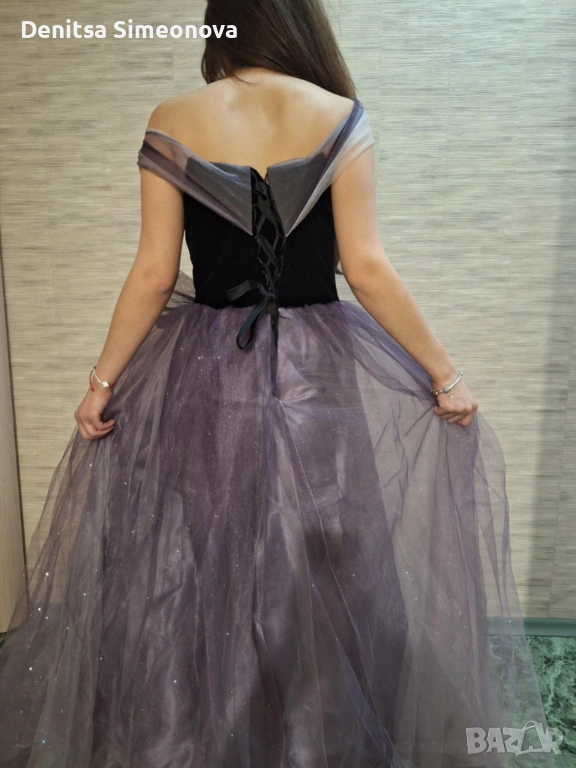 Роклята е чисто нова, само е пробвана, никога не е носена. Размерът е стандартен M, стяга с връзки отзад. Горната част е от плътно черно кадифе с вградени чашки за бюста. Полата е дълга и набрана, на три слоя-лилав сатен, светъл тюл и най-отгоре-лилав тюл с брокат. Панделката е свободна, може да се пришие на талията или отзад на кръста. Раменете са тюлени и паднали, стоят много красиво особено на гърба, на модела на снимките за съжаление роклята е голяма и не са фиксирани добре.