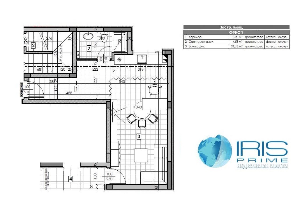 Разпределение: Офис зона, санитарен възел, коридор.