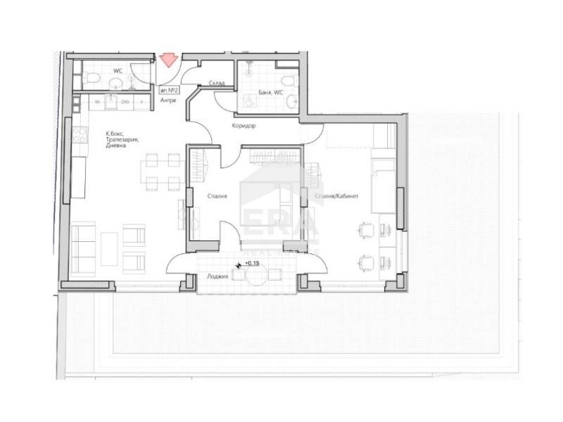 Разпределение: входно антре, дневна с кухненски бокс и трапезария 23.25 кв. м., 2 стаи, баня с тоалетна, отделна тоалетна, склад/мокро помещение, и просторна дворна тераса около целия апартамент. Изложение: Югоизток.