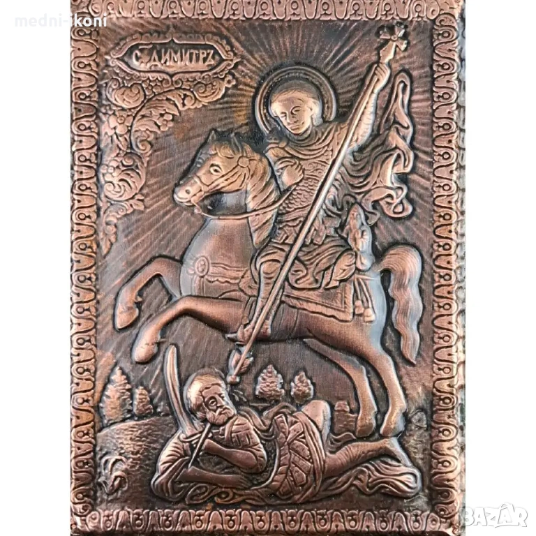 Иконата е ръчно изработена от чиста медна ламарина. Сложена е върху дъска от липа, която е небоядисана и обработена с огън. Тази икона е художествена репродукция на средновековна православна икона. На нея е изобразен Свети Великомъченик Димитър Чудотворец, който е роден през 3-ти век в Солун. Той бил назначен на висок военен пост със заповедта да преследва християните, но вместо това ги покровителствал и закрилял, насърчавал разпространението на Христовата вяра и загинал мъченически за нея. Смята се за покровител на строителите, на ковачи, техници, архитекти, инженери, металурзи и търговци. Подходящ подарък е за имен ден, рожден ден, кръщене и за освещаване на нов дом. Защитава семейството от всякакво зло, от недоброжелатели и стихийни бедствия. Носи спокойствие, успехи и благоденствие. Всяка една икона е уникат, притежава сертификат за автентичност, не е културна ценност и може да бъде изнасяна извън страната.