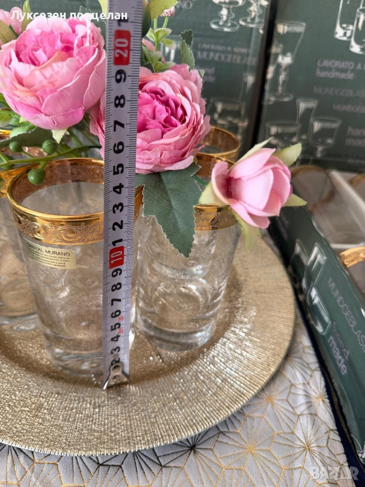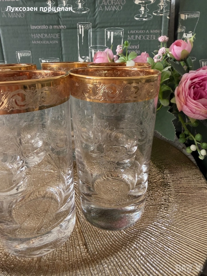 Изработени от ръчно издухано стъкло, с фина гравировка и ръчно нанесен златен ръб, което им придава изключително елегантен и луксозен вид. Подходящи за вода, безалкохолни напитки или за стилно подреждане на масата.