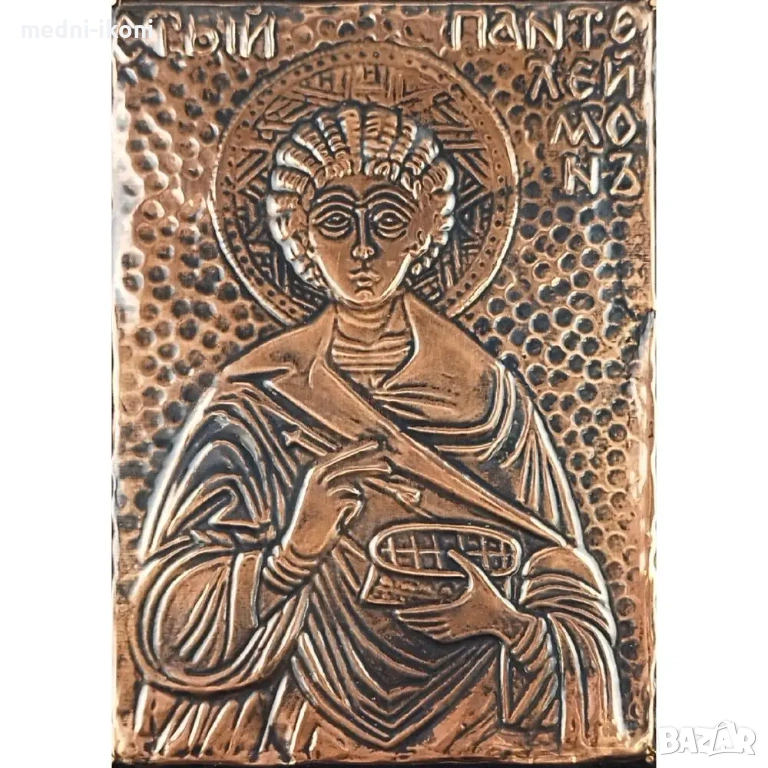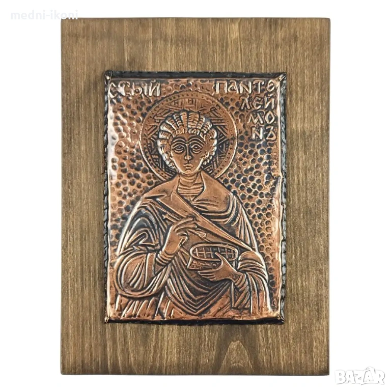Иконата е ръчно изработена от чиста медна ламарина. Сложена е върху дъска от липа, която е небоядисана и обработена с огън. Тази икона е художествена репродукция на средновековна православна икона. На нея е изобразен Свети Панталеймон, който е известен с това, че е страдал за Христовата вяра по времето на управление на римския имератор Максимиан Херкулий. Учил е медицина и е бил придворен лекар. Смята се за покровител на семейството, лекарите и акушерите.