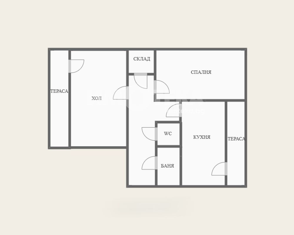Състои се от: отделна дневна, самостоятелна спалня, склад, кухня, отделно баня и тоалетна, две тераси.