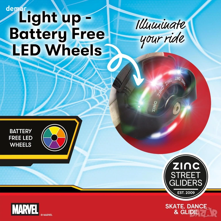 Светещите колела се активират при движение и не изискват батерии, създавайки ярък ефект по време на каране. Регулируемият дизайн с един размер е подходящ за растящи крачета и може лесно да се модифицира без инструменти за дългосрочна употреба. Гладките лагери ABEC-7 поддържат стабилно плъзгане по различни повърхности, помагайки на децата да изградят увереност по време на каране. Вградената задна спирачка на петата подобрява контрола и безопасността, а издръжливата конструкция издържа на ездачи до 50 кг. Тематичният дизайн, вдъхновен от популярен супергерой, насърчава въображаемата игра на открито и активното движение за деца на възраст 5 и повече години.