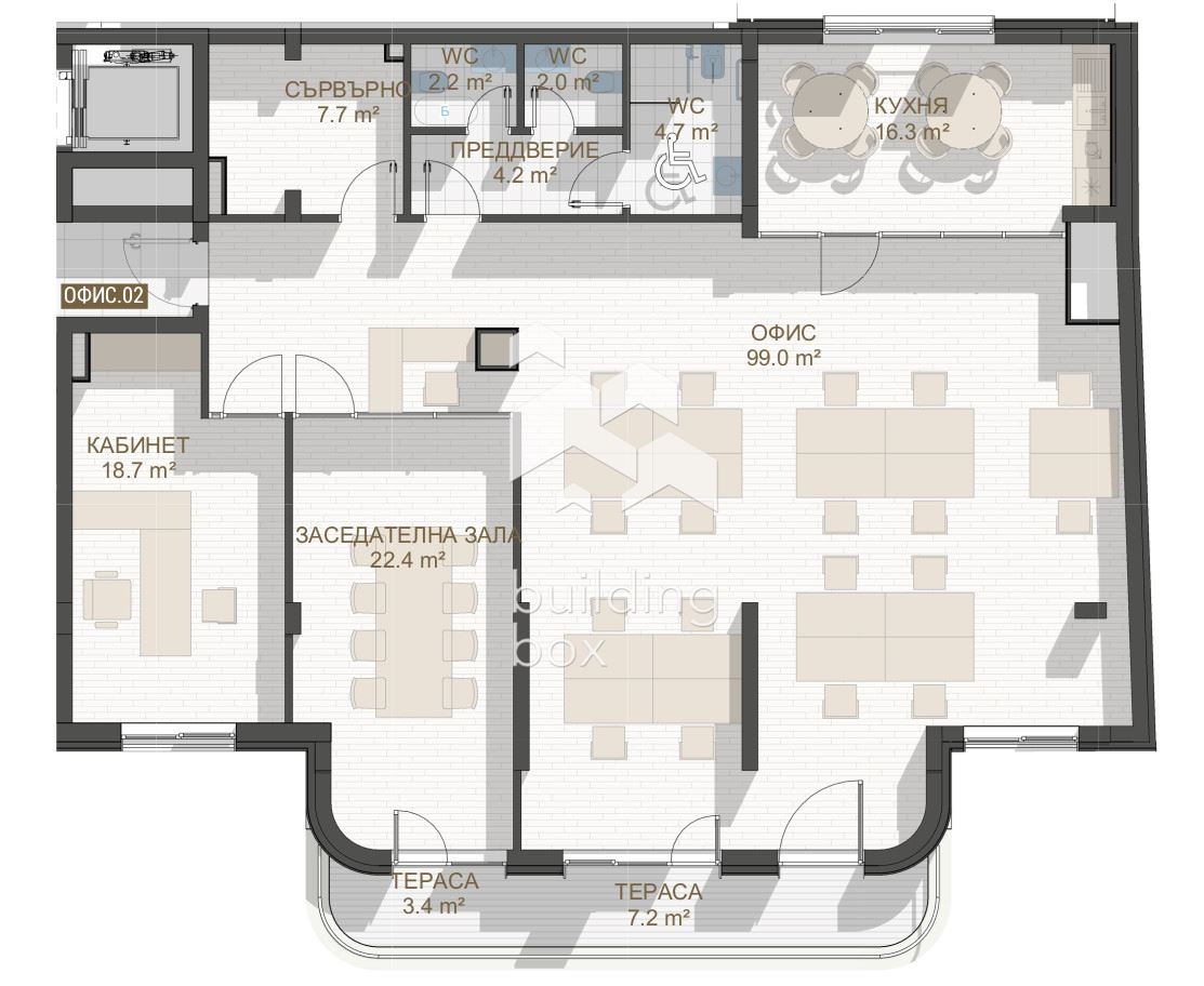 - РАЗПРЕДЕЛЕНИЕ: 'Open space' зала с площ 99 кв.м, две работни помещения с площ от 22 и 18 кв.м, кухня 16 кв.м, сервизно помещение с площ от 7 кв.м, три тоалетни и тераса.