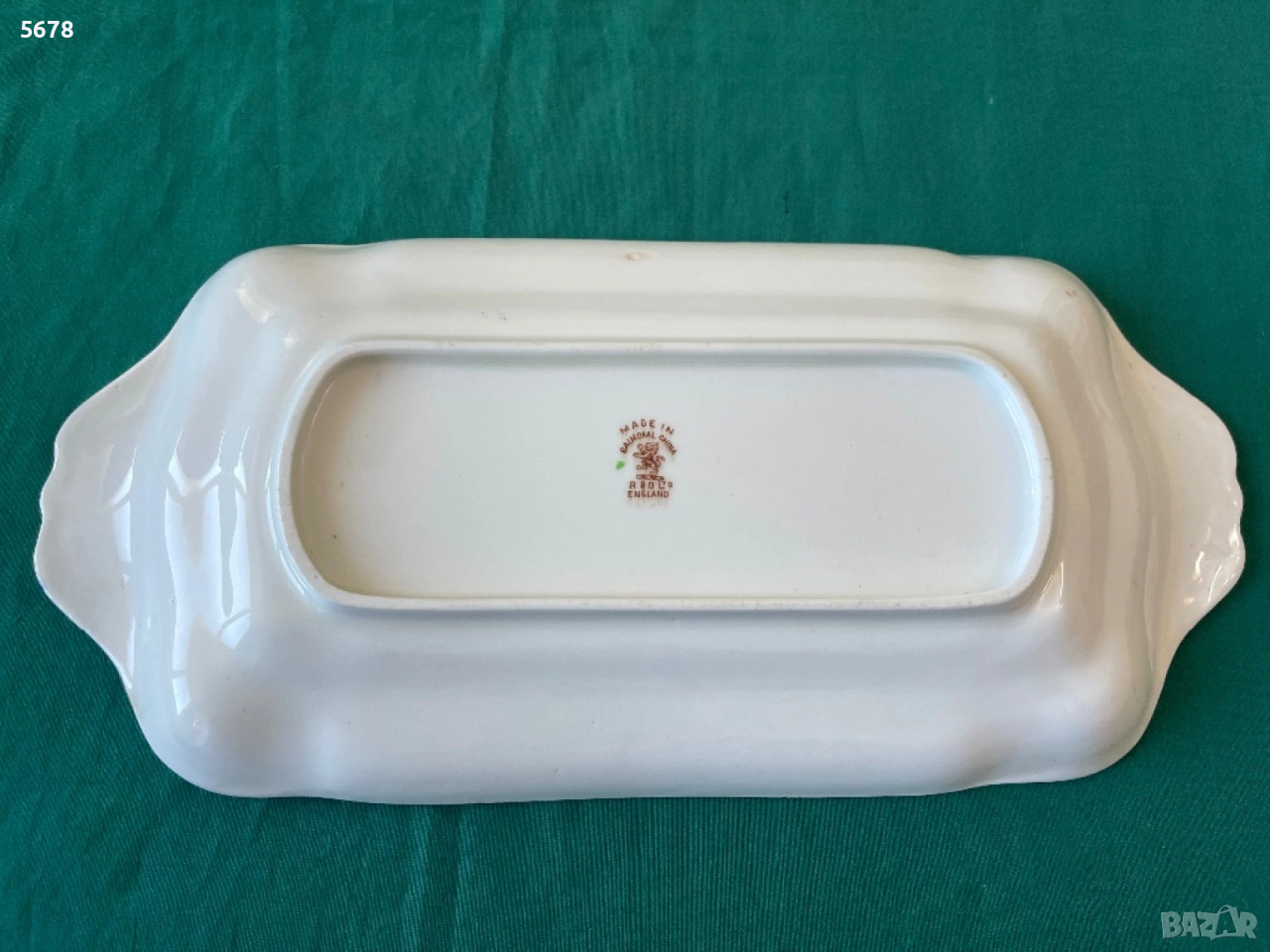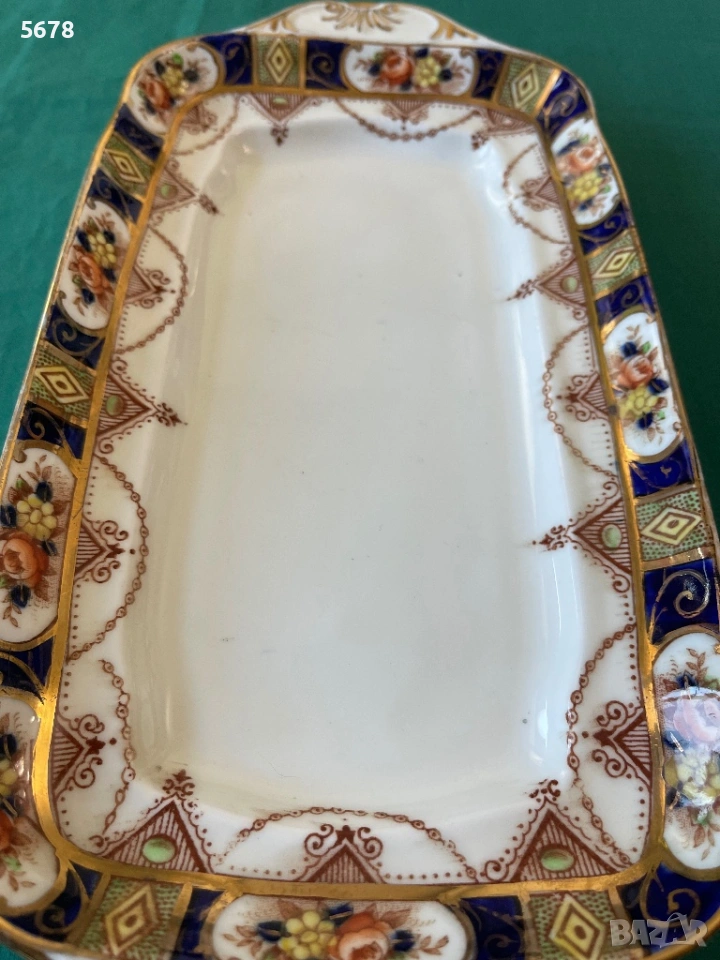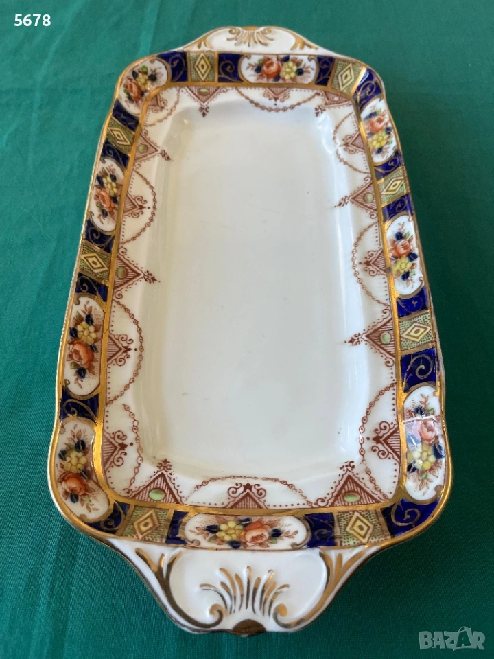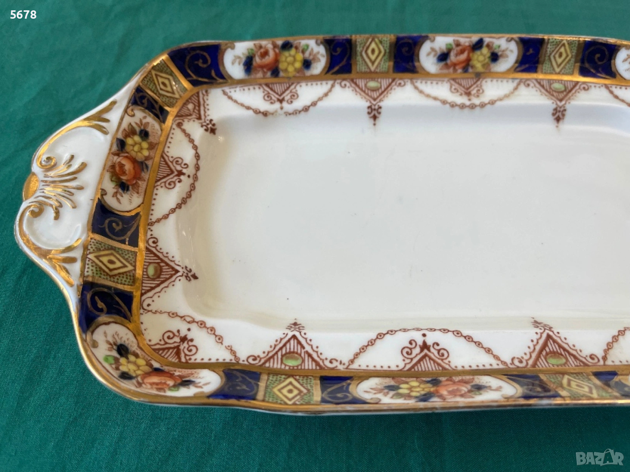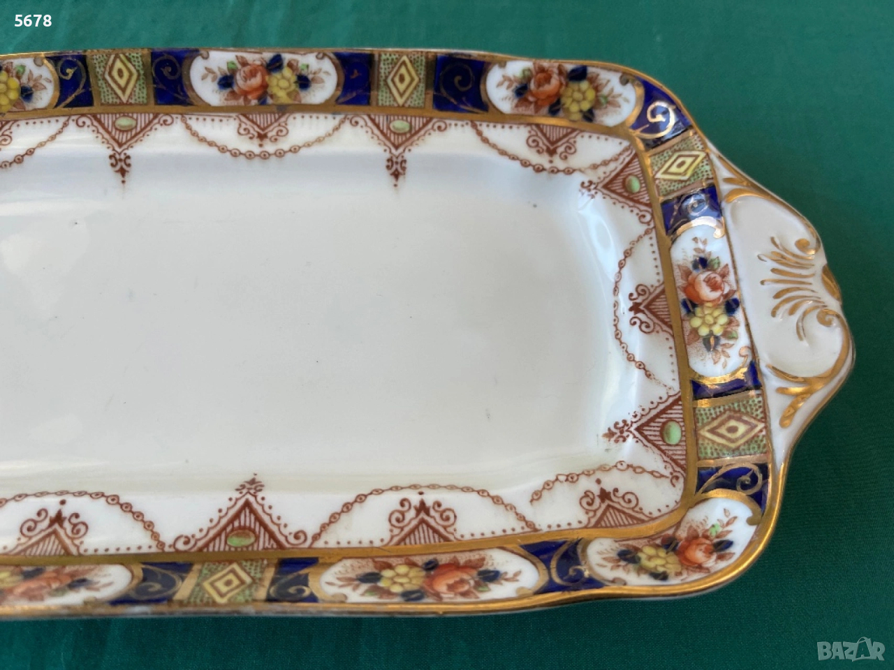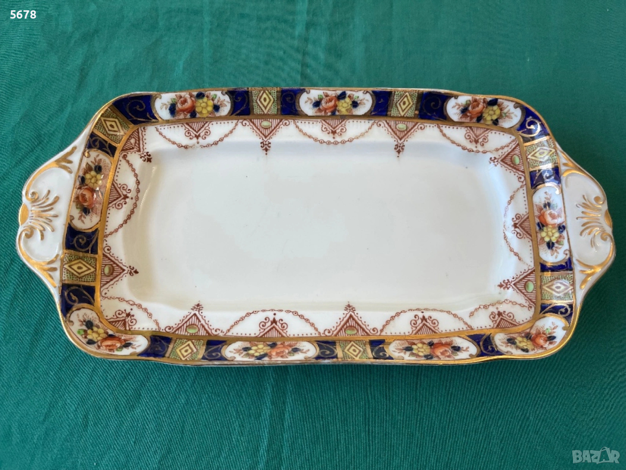 Красиво правоъгълно плато от английски порцелан Balmoral china, произведено от R&D Ltd-England. С богата декорация в кобалтово синьо, флорални мотиви и позлата, с елегантни декоративни дръжки от 30-те год.на миналия век. В много добро винтидж състояние, без пукнатини, без чипове, с добра позлата, минимални драскотинки .Дължина с дръжките-31,5 см;ширина- 15 см.