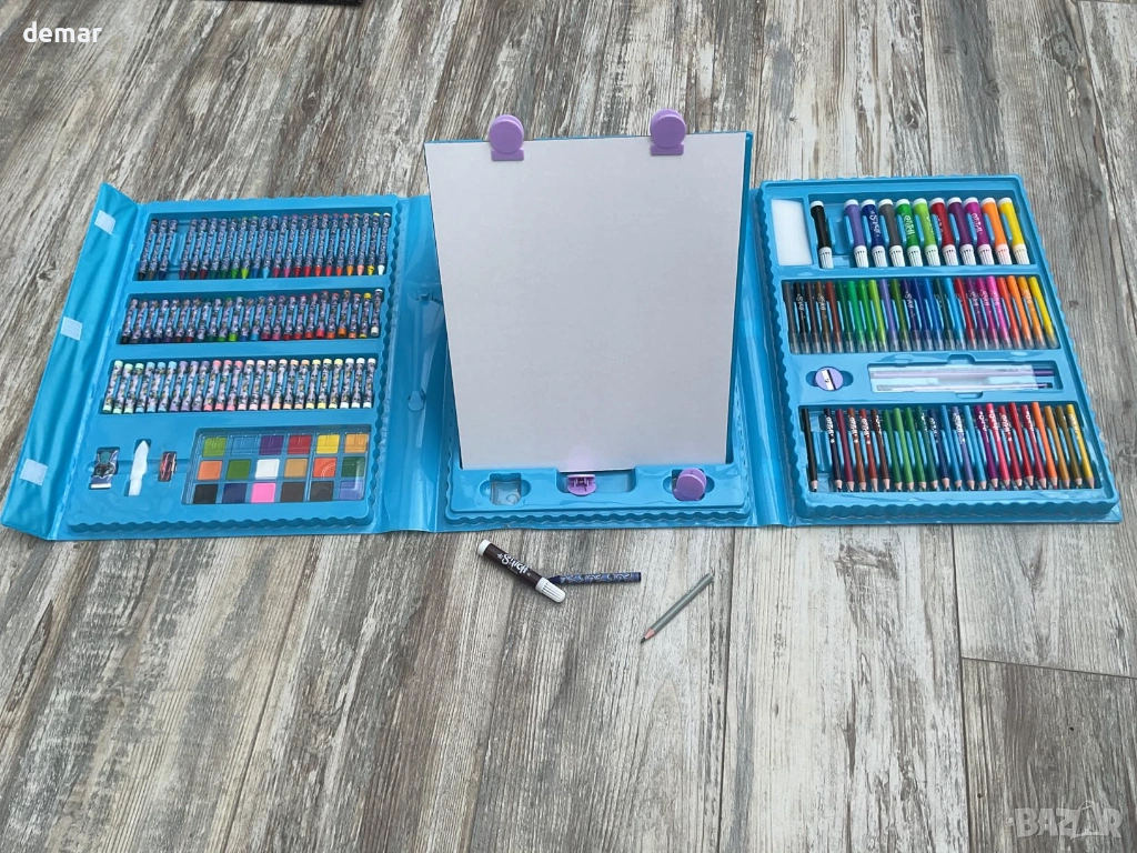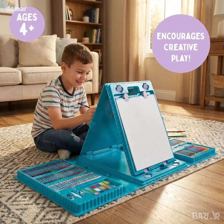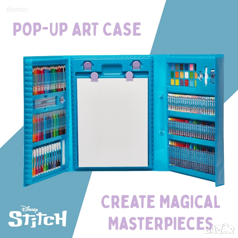 Пълен комплект за детско изкуство от 162 части, предназначен да превърне всяко пространство в творческо студио. Включва умен сгъваем статив с повърхности за бяла и черна дъска, както и щипки за показване на произведения на изкуството. Комплектът предлага голямо разнообразие от творчески инструменти, включително мастилени кексчета, четки, флумастери, цветни моливи, восъчни пастели, маслени пастели, тебешири и гъба, което позволява на децата да изследват множество стилове изкуство в един комплект. Включени са и практични аксесоари като линийка, острилка, гумичка и молив HB, така че всичко е организирано и готово за употреба веднага. Сгъваемият статив се сгъва бързо и се съхранява в плоско състояние, което го прави подходящ за по-малки пространства, като същевременно насърчава въображаемата игра и артистичната креативност, вдъхновени от приключенията на Стич.
