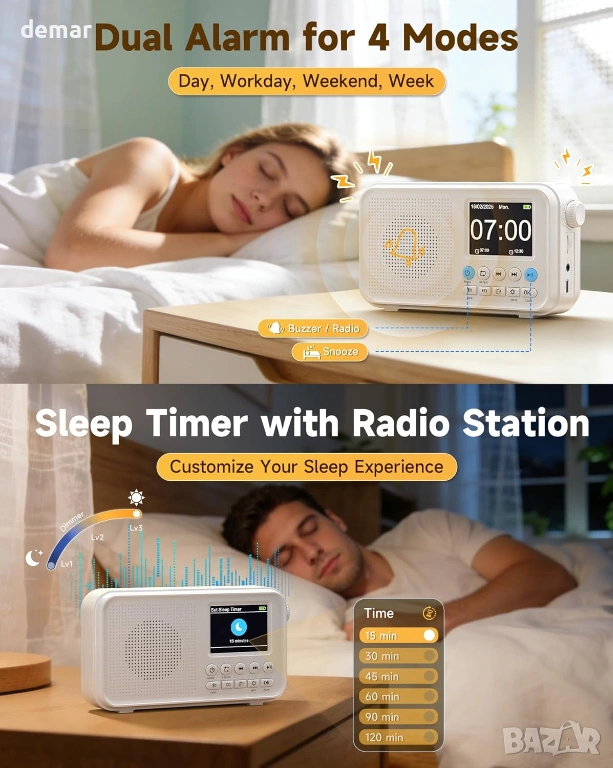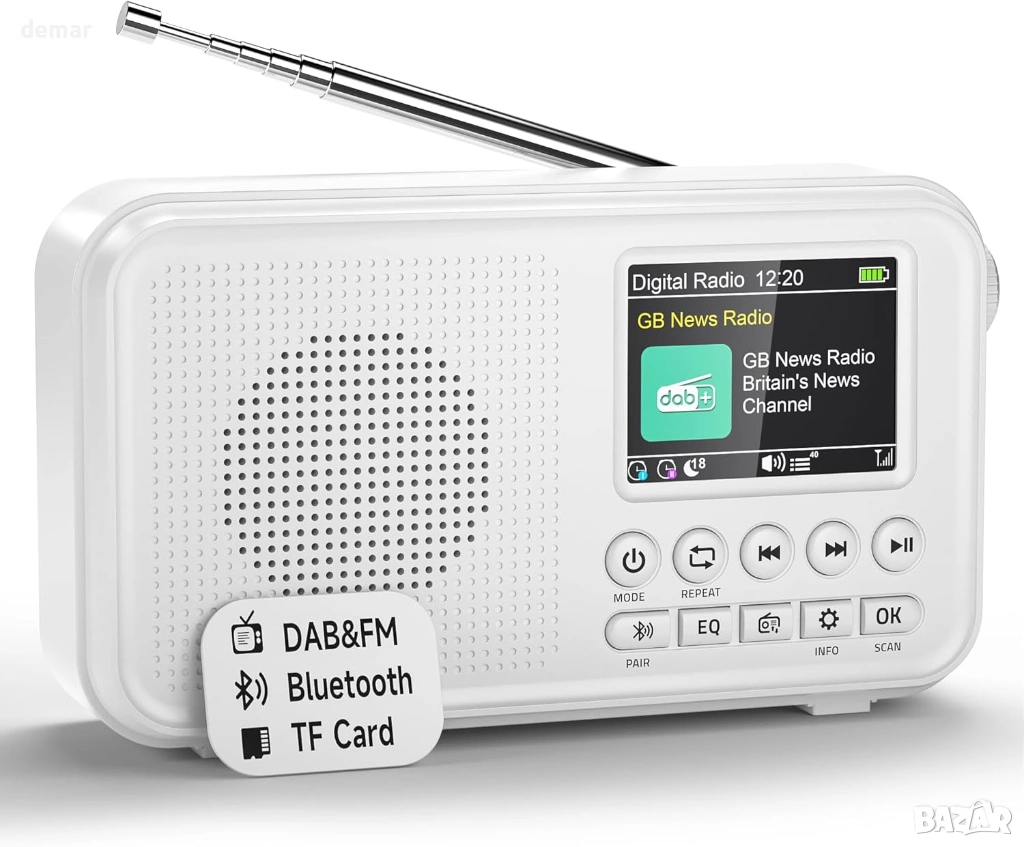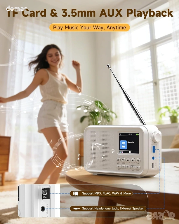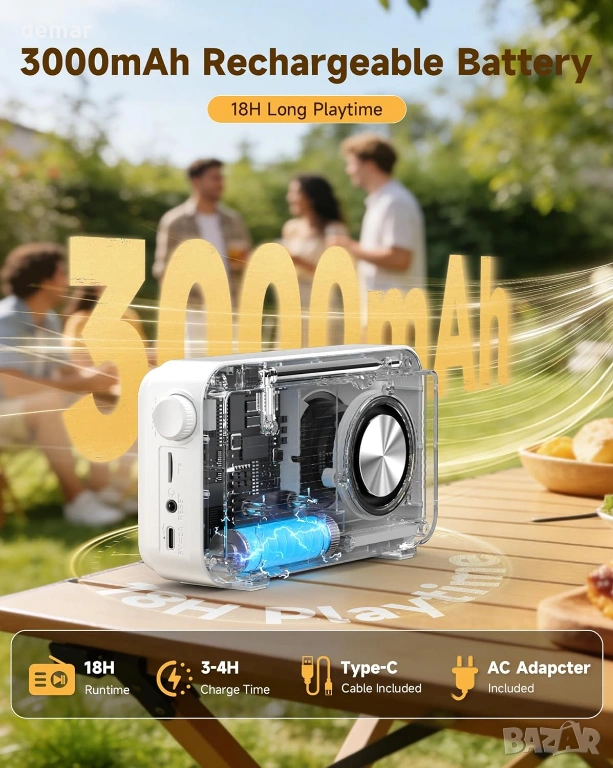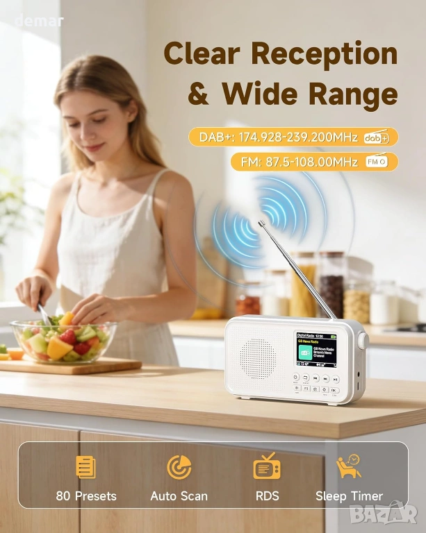 Преносимо DAB+/DAB и FM радио с високочувствително приемане и намалени смущения, предлагащо достъп до много станции и съхранение на до 40 DAB и 40 FM предварително зададени настройки. 2,4-инчов TFT цветен дисплей показва ясно подробности за станцията, часа и настройките, а простите бутони позволяват лесно управление. Вградената акумулаторна батерия с капацитет 3000mAh осигурява до 18 часа възпроизвеждане и поддържа зареждане или непрекъсната употреба чрез USB-C захранване. Bluetooth 5.0 позволява безжично стрийминг от телефони, таблети или компютри, поддържан от 8W високоговорител и шест избираеми режима на звука с еквалайзер. Допълнителните опции за възпроизвеждане включват поддръжка на TF карта за офлайн музика и 3,5 мм AUX порт за слушалки или външни високоговорители. Разполага също с двойна аларма, функция за отлагане, регулируем таймер за заспиване и тристепенна подсветка, което го прави подходящ за ежедневно слушане у дома или в движение.