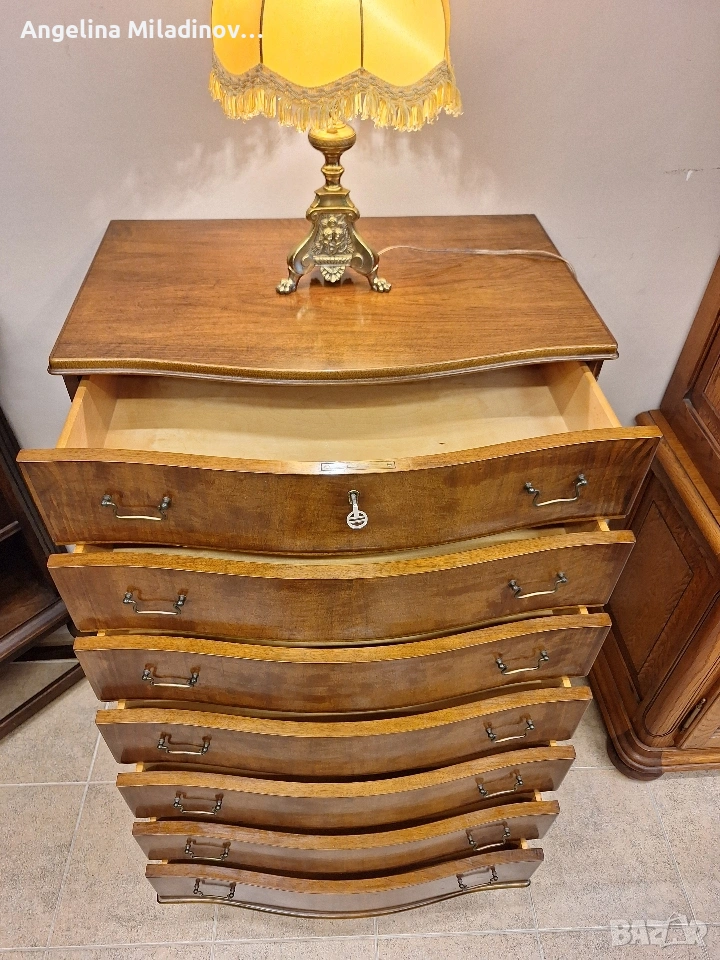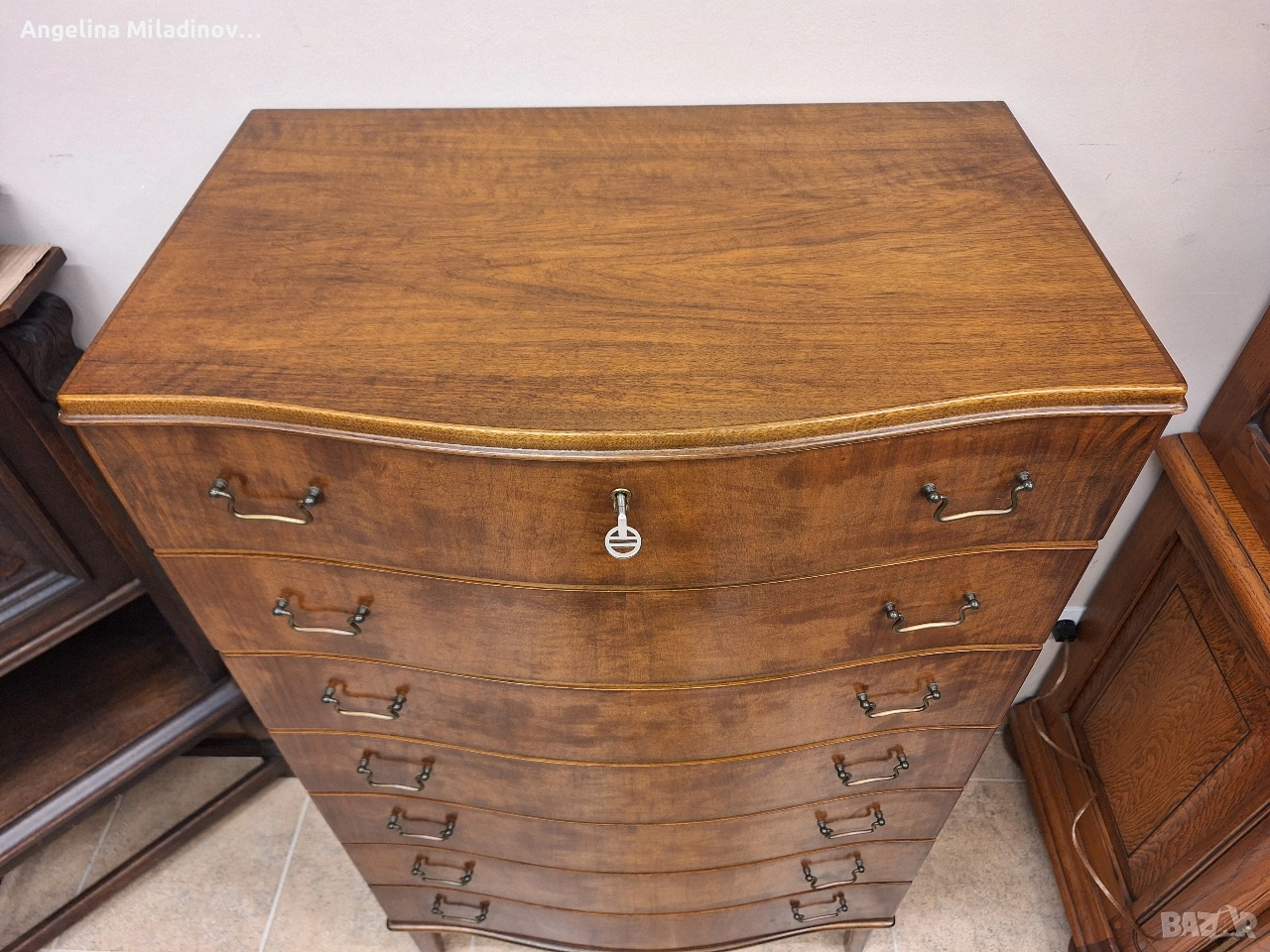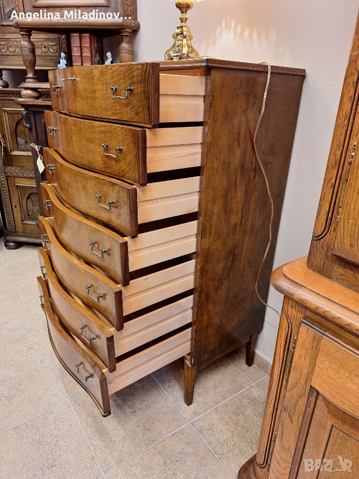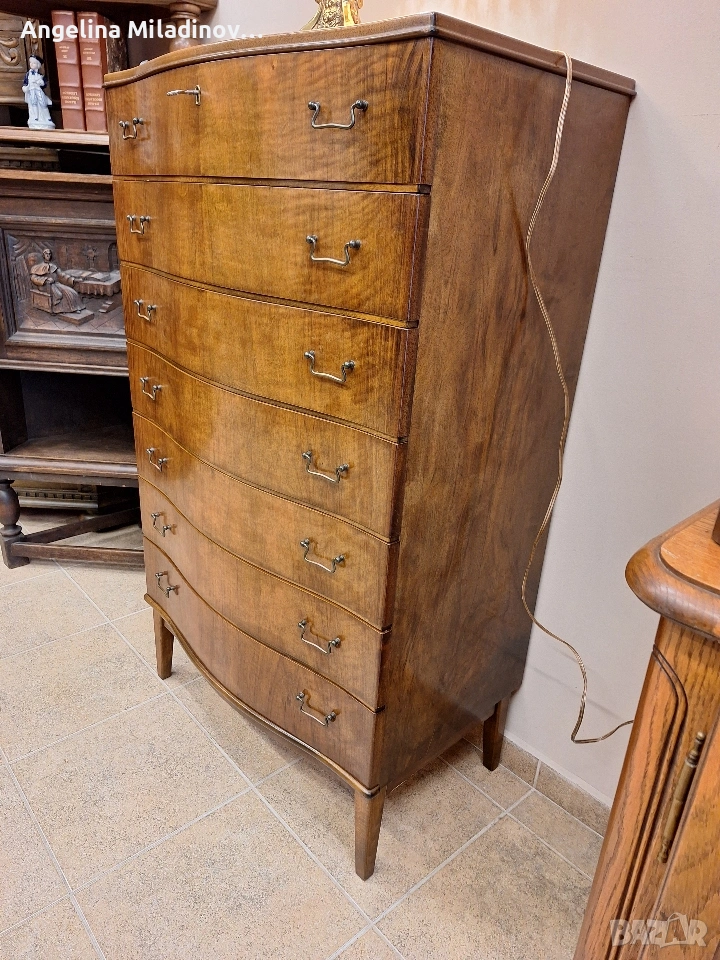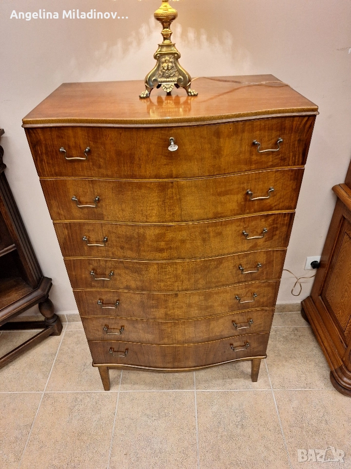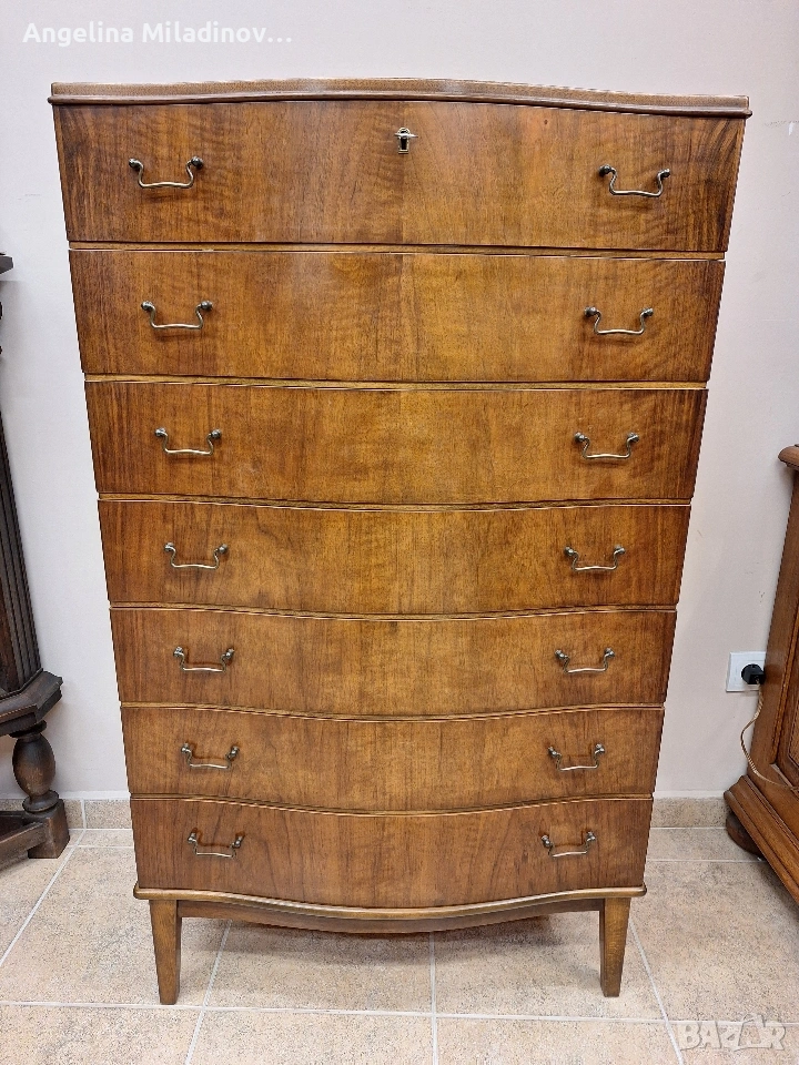 Датски скрин Mid Centory. Красив, голям, винтидж датски скрин със 7 чекмеджета от 60-те години на миналия век. Скринът е в красив топъл дървесен цвят в отлично състояние! Има плавно движещи се чекмеджета с месингови дръжки. Разгледайте и другите ми обяви. Последвайте ни и във фейсбук Мебели шик. Предлагаме и изгоден транспорт за цялата страна. Размери: Дължина - 73 см. Ширина - 46 см. Височина - 121 см. Цена - 260 €. 508,52 лв. vintagemebel.olx.bg