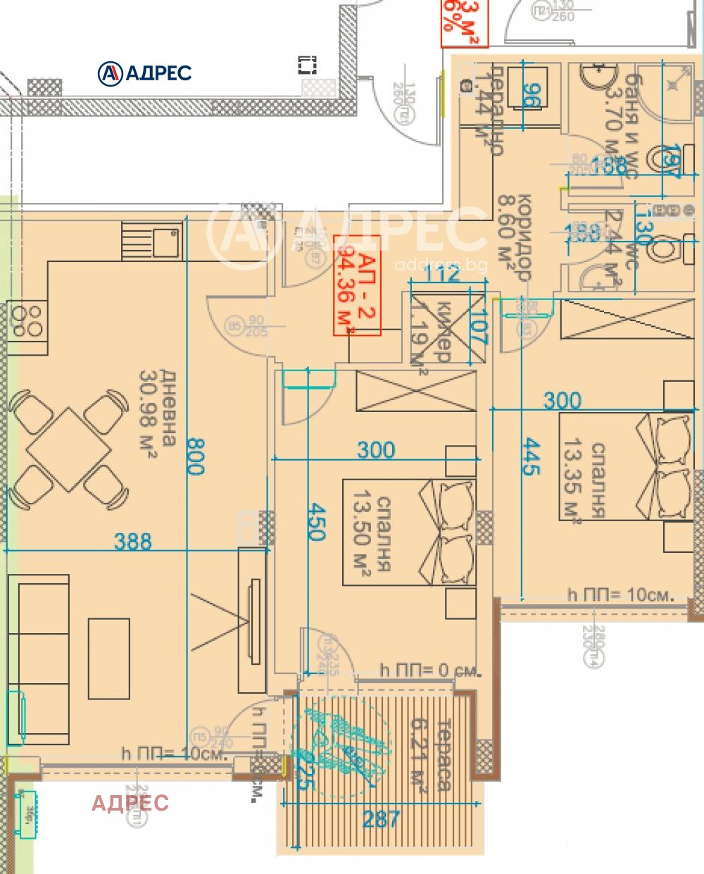 Тристаен апартамент, състоящ се от дневен тракт, две спални, баня с тоалет, тоалет, перално помещение, килер, антре и тераса. Изложение - югоизток.