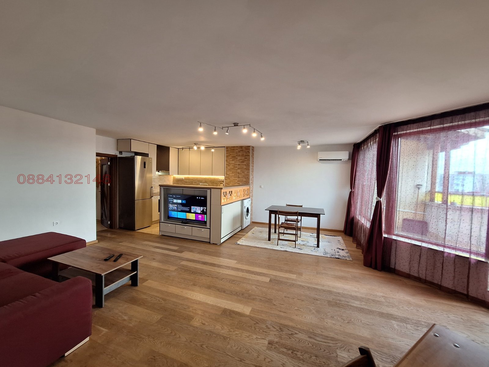Представяме ви тристайно жилище с обща площ 134 кв. м. на 200 м. от метрото, до Красно село и пазара му. Има много транспортни връзки, магазини, училища, болници, спортни и ритуални зали, банки и всичко каквото се сетите. Разположен е с източно, южно и западно изложение, като и от двете страни има перфектна панорама, особено в източно и южно направление. Входната врата е блиндирана.Има малко антре с достъп до спалня на запад , баня, килер и огромен хол над 40 кв. м. Настилки - дюшеме 22 мм. дебелина, гранитогрес в антре, кухня и баня. Вратата на банята от външната страна е с огледало алуминиева, останалите всичките са висок клас интериорни врати тип 'златен дъб'. Кухнята е само на няколко месеца нова и обзаведена в безупречно състояние. От външната и страна има специален шкаф за голям телевизор, който е защитен с рулетни вратички заради малки деца. дограмата е също висок клас. Има два изхода за голямата тераса, единият е от Мастер спалнята, а вторият е от хола директно. На терасата е обособена и покрита зона за барбекю. Излизаме вече на фасадната част на панорамната тераса, която е на изток и юг. За по-голям комфорт е с покрит навес и също в безупречно състояние. Жилището има топлоизолация, климатик , обзаведен и оборудван. Има също 600 мбпс интернет и кабелна телевизия включено към цената. Бюро за компютър , диван , две спални.