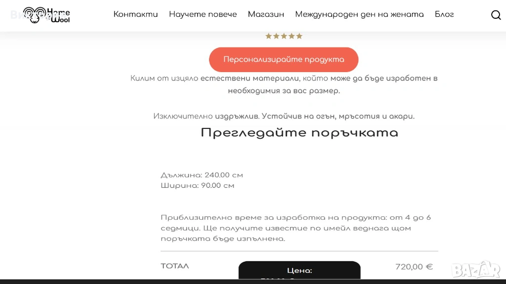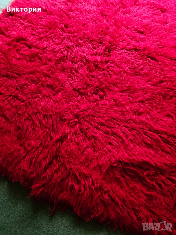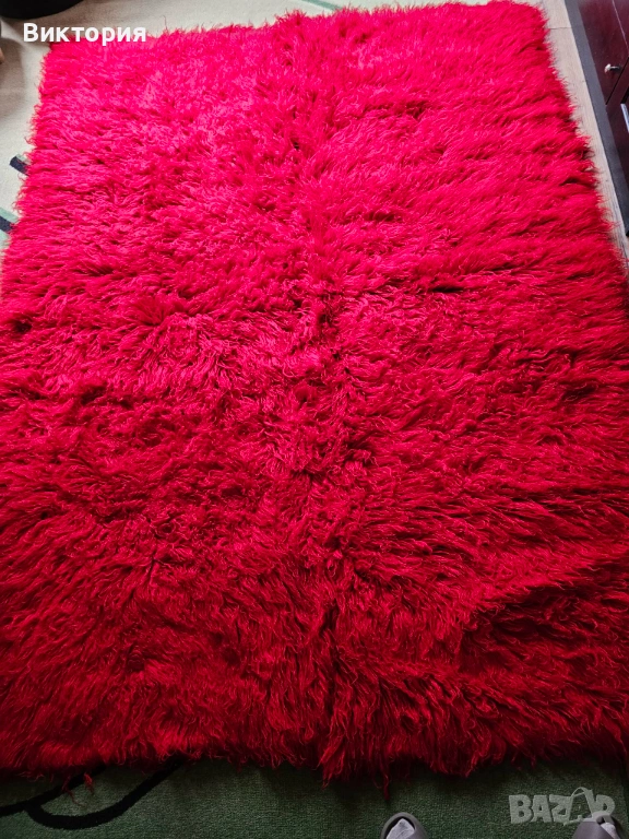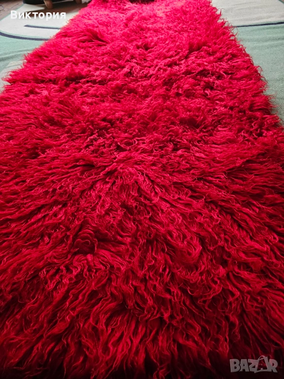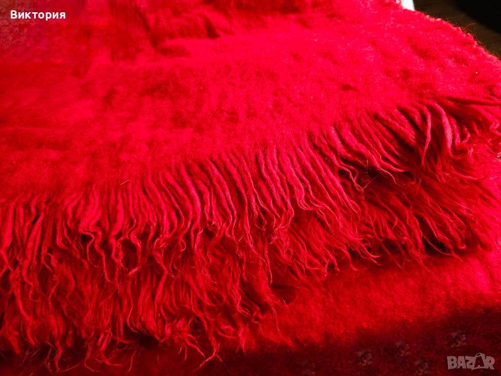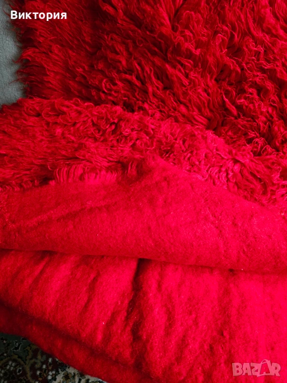 Цветът на всяка снимка, не знам защо излиза различно, но е ярко алено червено. Ето още малко инфо: " Ръчно тъкан вълнен килим: Изключително издръжлив. Устойчив на огън, мръсотия и акари. Множество научни изследвания доказват възможността на вълната и по-специфично на вълнените килими да абсорбират летливите органични съединения от въздуха в дома и по този начин да го пречистват. Вълната е хипоалергенна и подходяща както за новородени, така и за хора, страдащи от алергии и множествена химична чувствителност (MCS). Устойчива е на плесен. Антимикробна и антибактериална е. 100% биоразградим продукт, изработен с устойчиви и възобновяеми материали без синтетика."