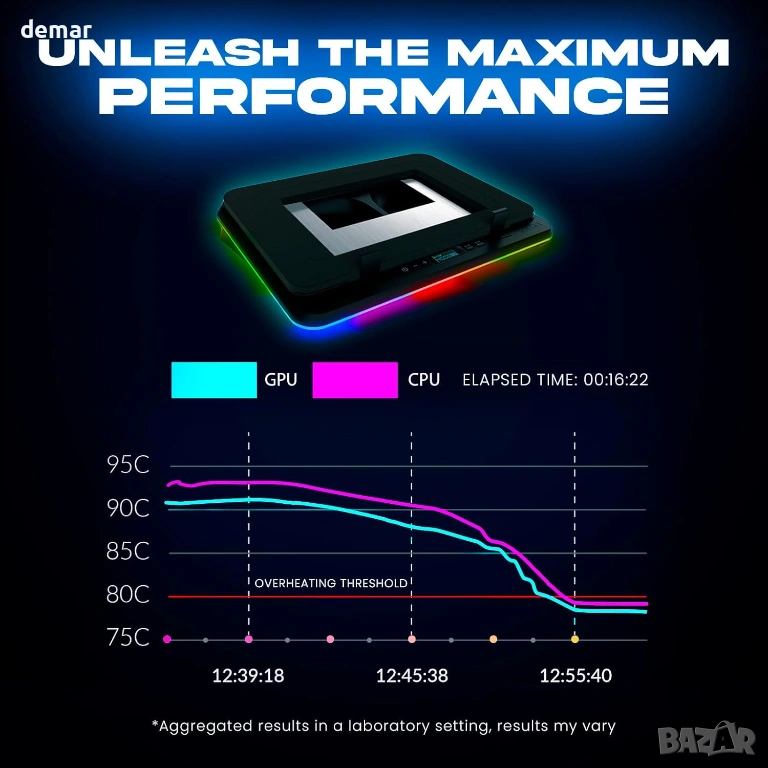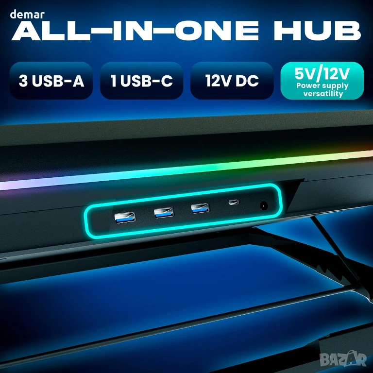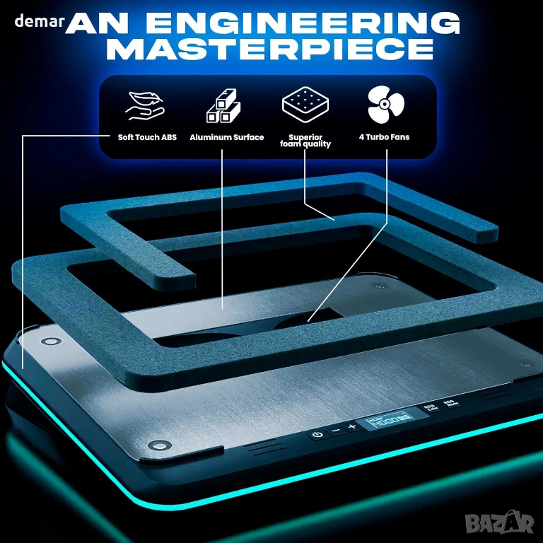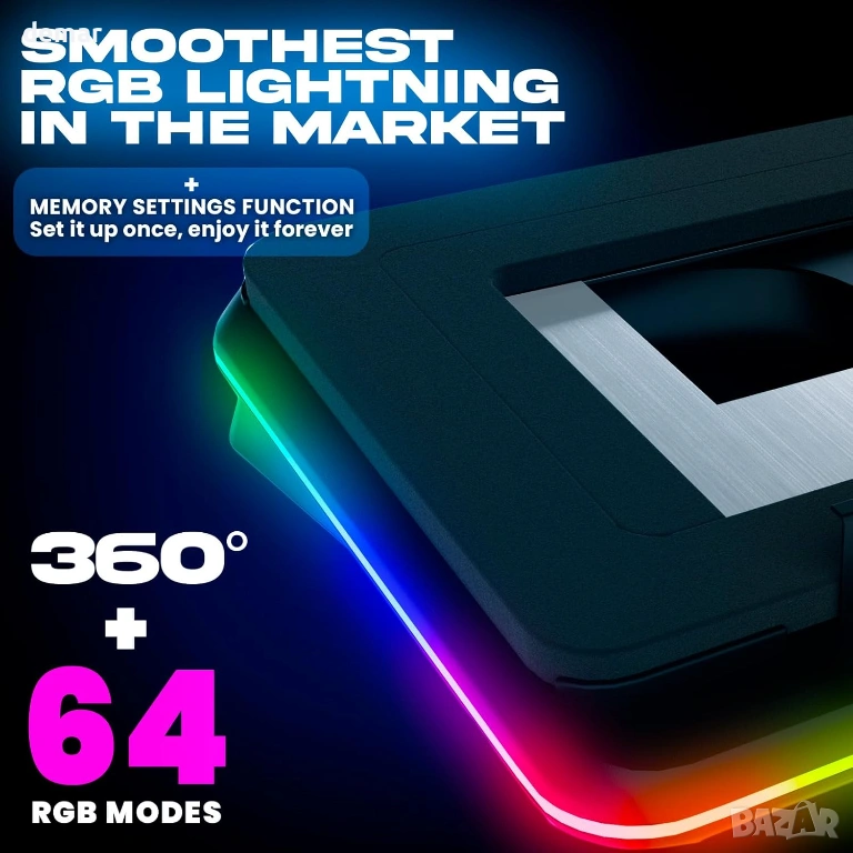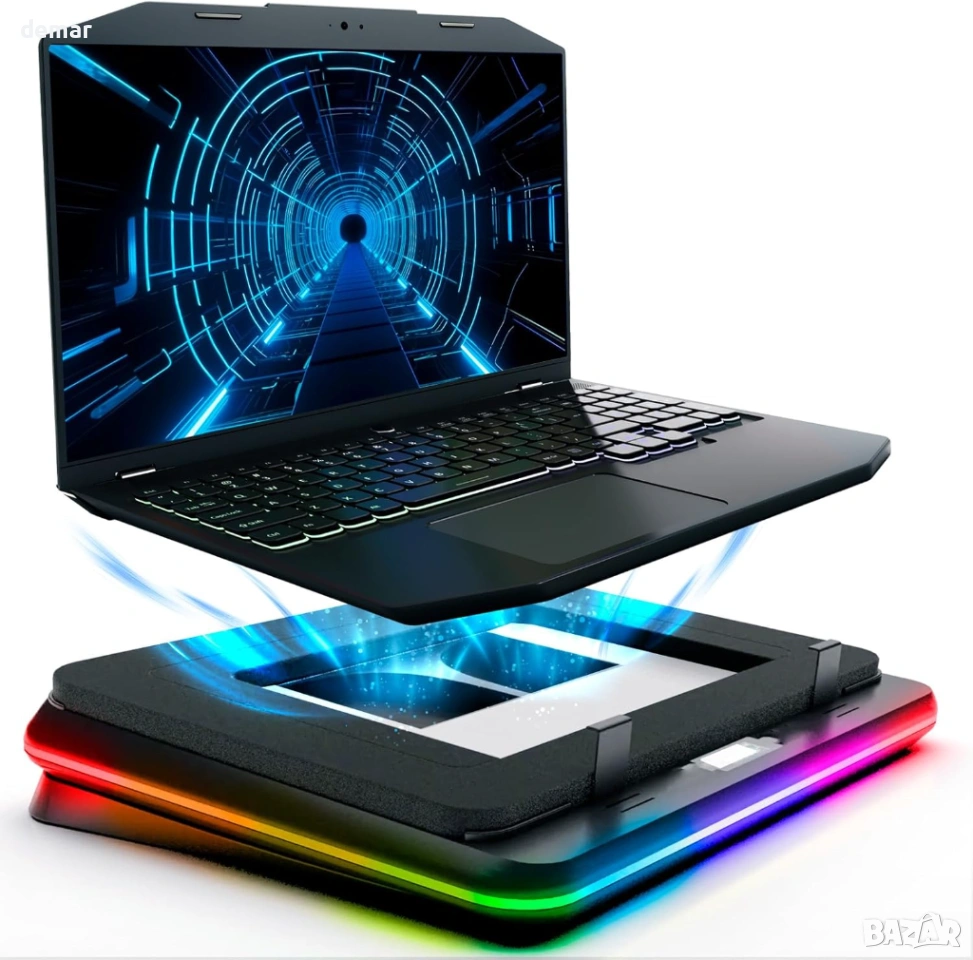 Високопроизводителна охлаждаща подложка за лаптоп с четири високоскоростни вентилатора, работещи заедно, за да осигурят мощен въздушен поток за ефективно намаляване на топлината по време на интензивна употреба. Изработена от алуминий, използван в самолети, за подобряване на разсейването на топлината и издръжливостта, а дизайнът против прах спомага за поддържане на постоянна охлаждаща производителност. Адаптивната шумопотискаща пяна е подходяща за лаптопи с размер до 17,3 инча, като минимизира шума, като същевременно поддържа силно охлаждане. Разполага с 360° RGB осветление с 64 персонализируеми ефекта и автоматично запазване на предпочитаните настройки за светлина и вентилатор. Поддържа двойни опции за захранване чрез контакт за стена или USB-C връзка и включва три USB-A порта, предлагайки гъвкаво захранване и свързаност, като същевременно поддържа широка гама от лаптопи хладни по време на игри или големи натоварвания.