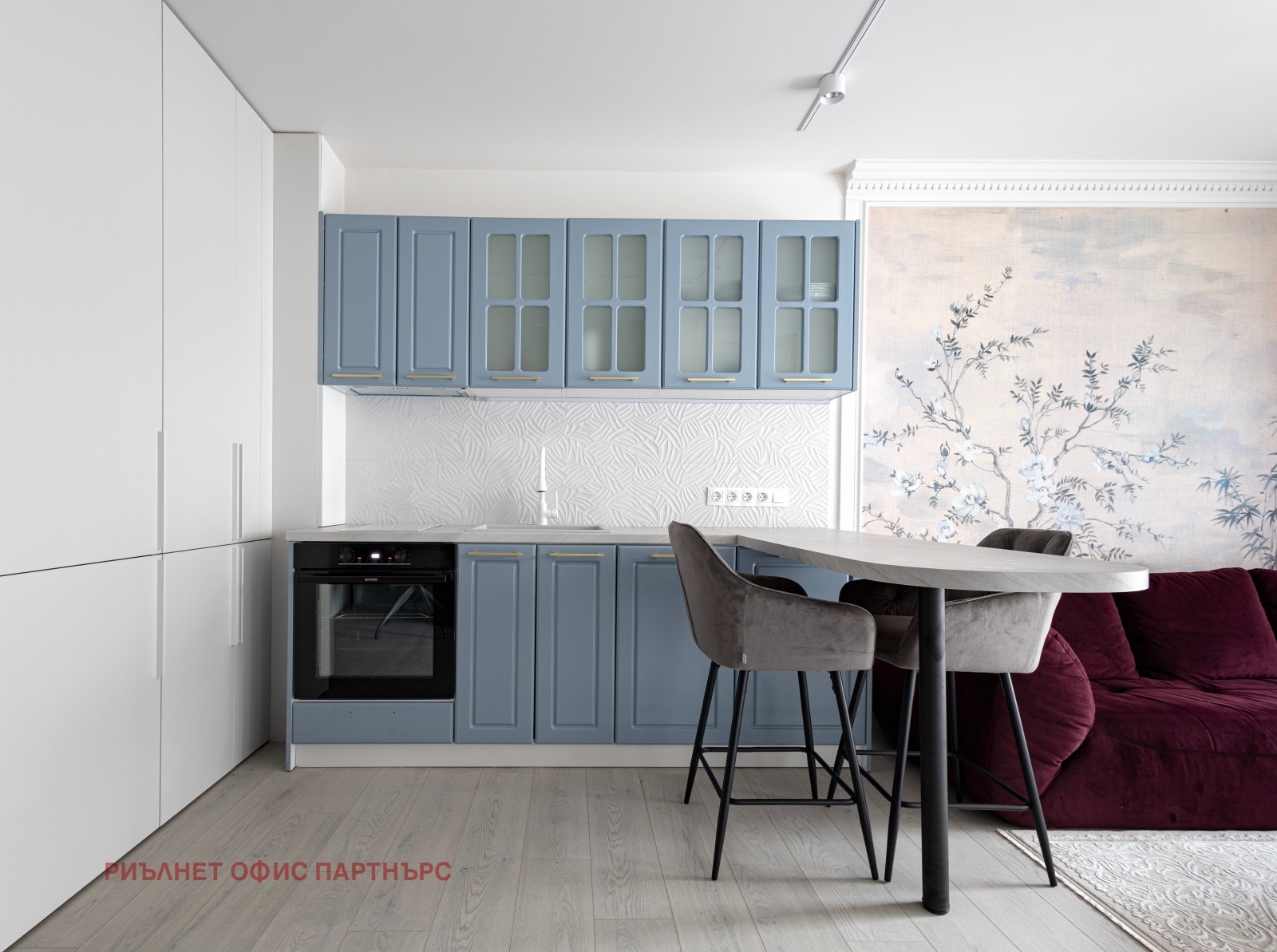 Просторна дневна с кухня и трапезария, обзаведена със стилни, нови мебели и оборудвана с висок клас уреди.