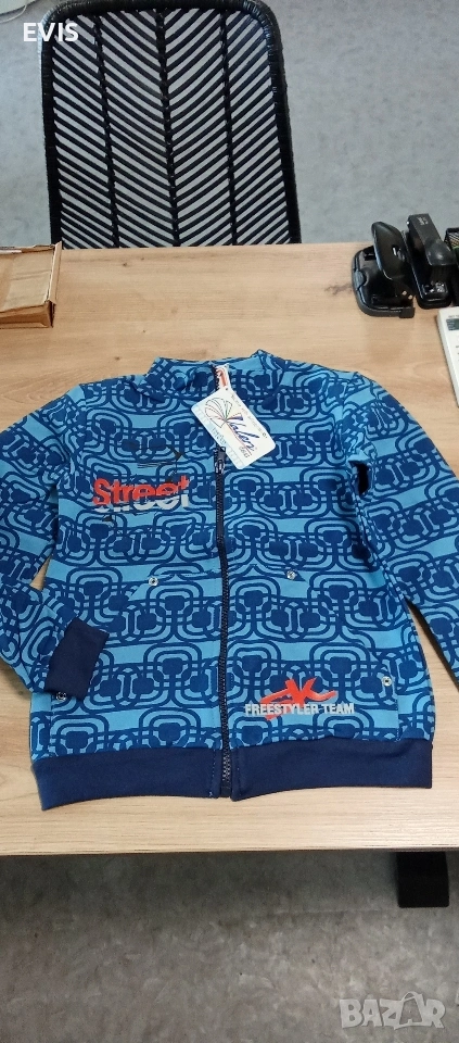 👕 Ново детско горнище / суитшърт с етикет – Freestyler Team Продавам чисто ново детско горнище със спортен дизайн, подходящо за ежедневието или за игри навън. Дрехата е с етикет, което я прави идеална и за подарък! ✅ Основни характеристики: Състояние: Ново, с етикет. 95% памук 5% еластан Дизайн: Модерен десен в нюанси на синьото с надписи "Street" и "Freestyler Team". Детайли: Пълен цип за лесно обличане, ластик на ръкавите и долната част за по-голям комфорт. Джобове: Практични предни джобове за дребни вещи. 📦 Доставка и плащане: Изпращам бързо и сигурно с предпочитания от Вас куриер: Еконт или Спиди. Задължителна опция "Преглед и тест" преди плащане, за да сте спокойни, че всичко е наред.