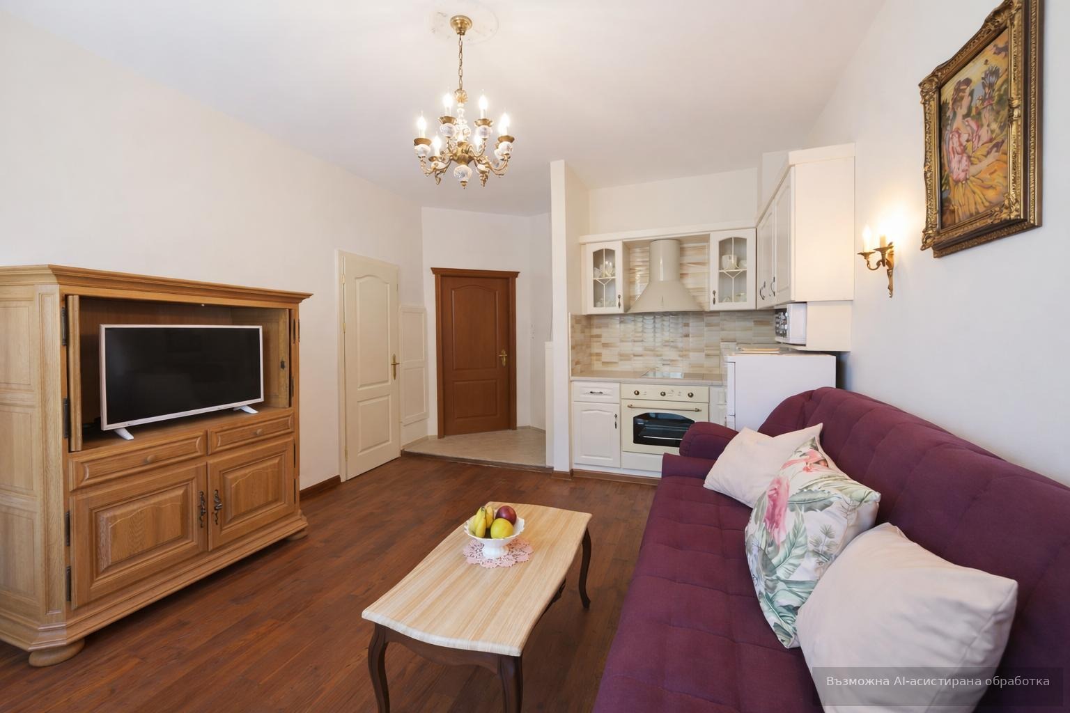 Разполага с площ 50кв.м и се състои от: входно антре, хол с кухненски бокс, спалня, баня с тоалетна и тераса с изглед към Стария град.