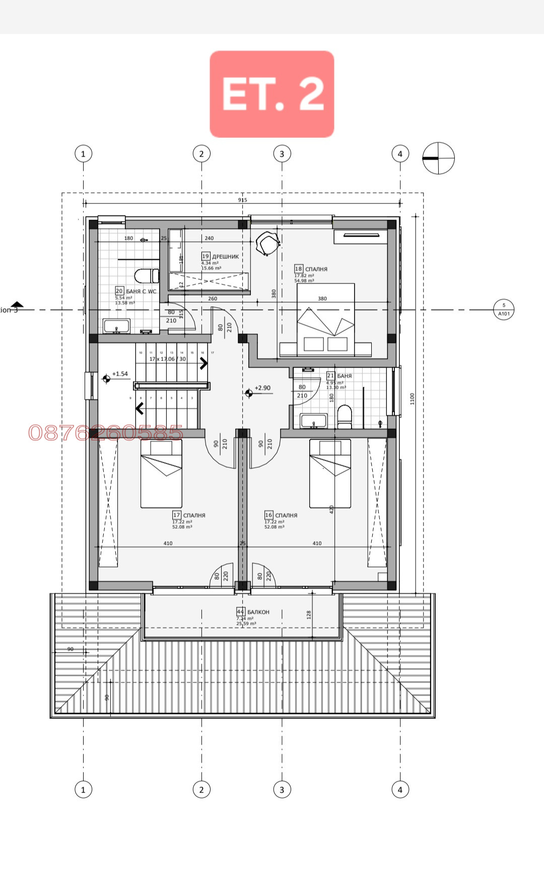 - 4 спални (ет.1- 14.50 кв.м., ет.2 - 17кв.м.,17кв.м.,18 кв.м.+4 кв.м. дрешник)