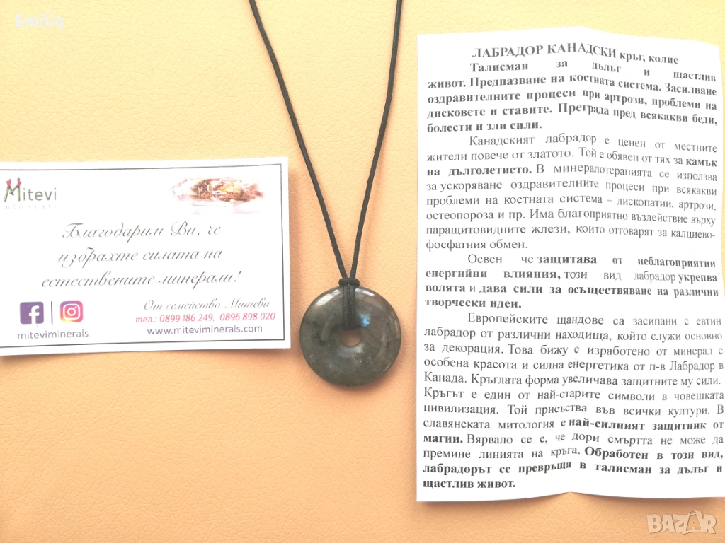 Европейските щандове са засипани с евтин лабрадор от различни находища, който служи основно за декорация. Това бижу е изработено от минерал с особена красота и силна енергетика от п-в Лабрадор в Канада. Кръглата форма увеличава защитните му сили.