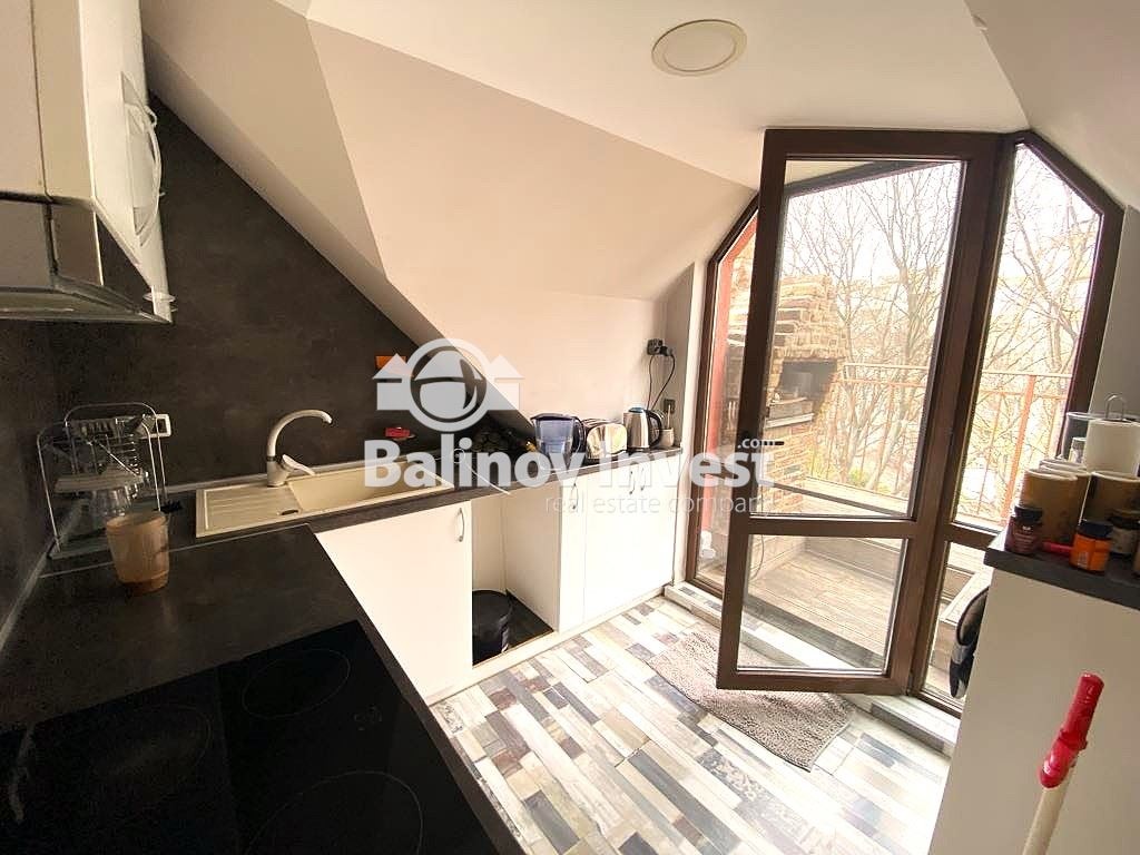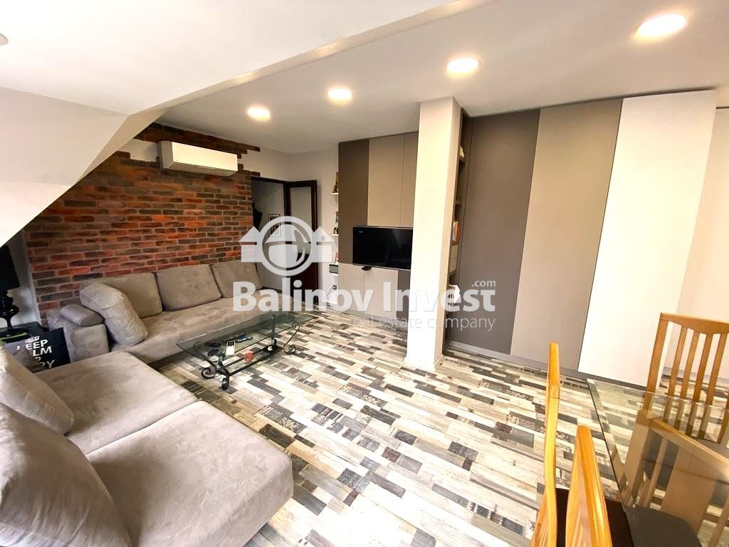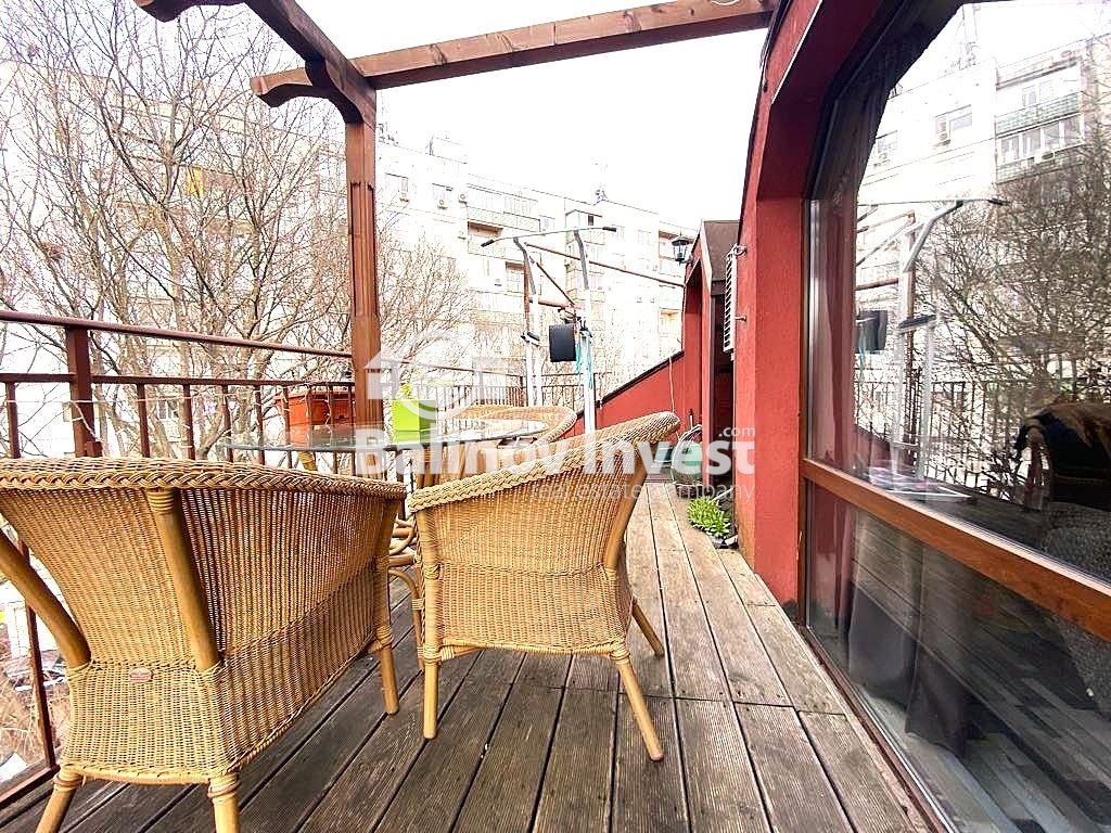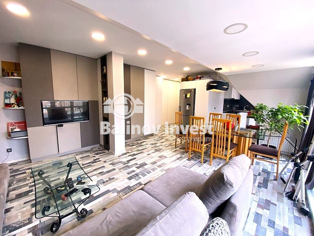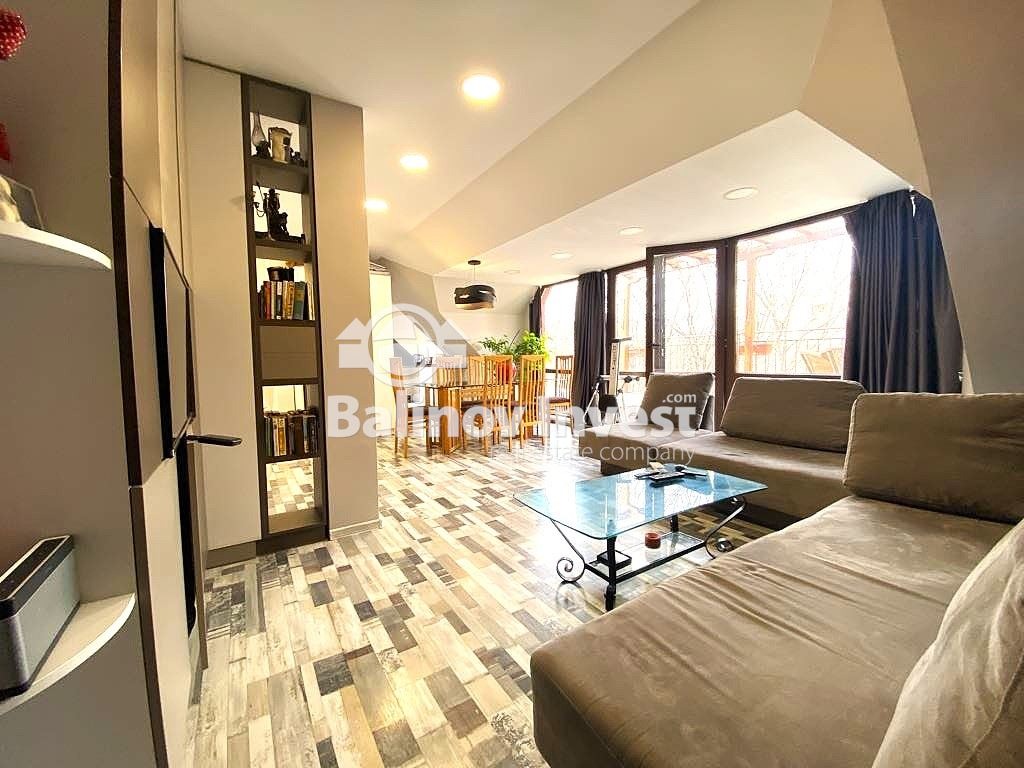 Продава обзаведен апартамент с площ от 104 м2,. разположен на 4-ти последен етаж без асансьор. Състои се от: антре, баня с тоалетна, просторна дневна с кухненски бокс, спалня, обща тесара пред двете стаи. Стълбища към покривна тераса. С телфер на терасата за удобство.